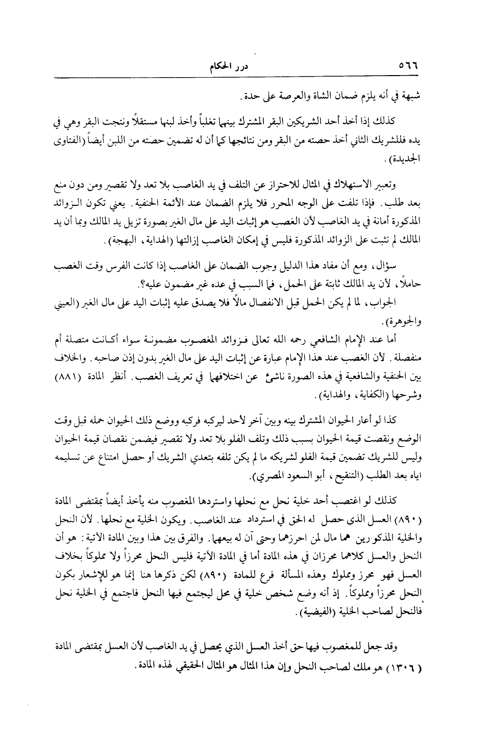 كَذَلِكَ لَوْ اغْتَصَبَ أَحَدٌ خَلِيَّةَ نَحْلٍ مَعَ نَحْلِهَا وَاسْتَرَدَّهَا الْمَغْصُوبُ مِنْهُ يَأْخُذُ أَيْضًا بِمُقْتَضَى الْمَادَّةِ (890) الْعَسَلَ الَّذِي حَصَلَ عِنْدَ الْغَاصِبِ. وَيَكُونُ لَهُ الْحَقُّ فِي اسْتِرْدَادِ الْخَلِيَّةِ مَعَ نَحْلِهَا. لِأَنَّ النَّحْلَ وَالْخَلِيَّةَ الْمَذْكُورَيْنِ هُمَا مَالٌ لِمَنْ أَحْرَزَهُمَا وَحَتَّى أَنَّ لَهُ بَيْعَهُمَا. وَالْفَرْقُ بَيْنَ هَذَا وَبَيْنَ الْمَادَّةِ الْآتِيَةِ: هُوَ أَنَّ النَّحْلَ وَالْعَسَلَ كِلَاهُمَا مُحْرَزَانِ فِي هَذِهِ الْمَادَّةِ أَمَّا فِي الْمَادَّةِ الْآتِيَةِ فَلَيْسَ النَّحْلُ مُحْرَزًا وَلَا مَمْلُوكًا بِخِلَافِ الْعَسَلِ فَهُوَ مُحْرَزٌ وَمَمْلُوكٌ وَهَذِهِ الْمَسْأَلَةُ فَرْعٌ لِلْمَادَّةِ (890) لَكِنَّ ذِكْرَهَا هُنَا إنَّمَا هُوَ لِلْإِشْعَارِ بِكَوْنِ النَّحْلِ مُحْرَزًا وَمَمْلُوكًا. إذْ إنَّهُ لَوْ وَضَعَ شَخْصٌ خَلِيَّةً فِي مَحِلٍّ لِيَجْتَمِعَ فِيهَا النَّحْلُ فَاجْتَمَعَ فِي الْخَلِيَّةِ نَحْلٌ فَالنَّحْلُ لِصَاحِبِ الْخَلِيَّةِ (الْفَيْضِيَّةُ) . وَقَدْ جُعِلَ لِلْمَغْصُوبِ فِيهَا حَقُّ أَخْذِ الْعَسَلِ الَّذِي يَحْصُلُ فِي يَدِ الْغَاصِبِ لِأَنَّ الْعَسَلَ بِمُقْتَضَى الْمَادَّةِ (1306) هُوَ مِلْكٌ لِصَاحِبِ النَّحْلِ وَإِنَّ هَذَا الْمِثَالَ هُوَ الْمِثَالُ الْحَقِيقِيُّ لِهَذِهِ الْمَادَّةِ.