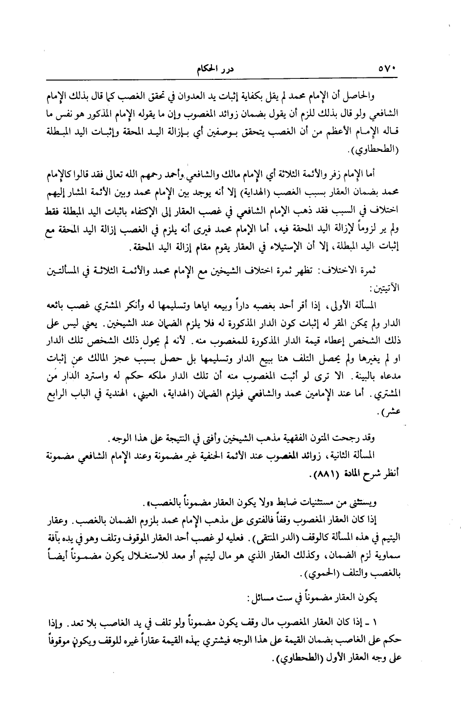 وَالْحَاصِلُ أَنَّ الْإِمَامَ مُحَمَّدًا لَمْ يَقُلْ بِكِفَايَةِ إثْبَاتِ يَدِ الْعُدْوَانِ فِي تَحَقُّقِ الْغَصْبِ كَمَا قَالَ بِذَلِكَ الْإِمَامُ الشَّافِعِيُّ وَلَوْ قَالَ بِذَلِكَ لَلَزِمَ أَنْ يَقُولَ بِضَمَانِ زَوَائِدِ الْمَغْصُوبِ وَإِنَّ مَا يَقُولُهُ الْإِمَامُ الْمَذْكُورُ هُوَ نَفْسُ مَا قَالَهُ الْإِمَامُ الْأَعْظَمُ مِنْ أَنَّ الْغَصْبَ يَتَحَقَّقُ بِوَصْفَيْنِ أَيْ بِإِزَالَةِ الْيَدِ الْمُحِقَّةِ وَإِثْبَاتِ الْيَدِ الْمُبْطِلَةِ (الطَّحْطَاوِيُّ) . أَمَّا الْإِمَامُ زُفَرُ وَالْأَئِمَّةُ الثَّلَاثَةُ أَيْ الْإِمَامُ مَالِكٌ وَالشَّافِعِيُّ وَأَحْمَدُ رَحِمَهُمْ اللَّهُ تَعَالَى فَقَدْ قَالُوا كَالْإِمَامِ مُحَمَّدٍ بِضَمَانِ الْعَقَارِ بِسَبَبِ الْغَصْبِ (الْهِدَايَةُ) إلَّا أَنَّهُ يُوجَدُ بَيْنَ الْإِمَامِ مُحَمَّدٍ وَبَيْنَ الْأَئِمَّةِ الْمُشَارِ إلَيْهِمْ اخْتِلَافٌ فِي السَّبَبِ فَقَدْ ذَهَبَ الْإِمَامُ الشَّافِعِيُّ فِي غَصْبِ الْعَقَارِ إلَى الِاكْتِفَاءِ بِإِثْبَاتِ الْيَدِ الْمُبْطِلَةِ فَقَطْ وَلَمْ يَرَ لُزُومًا لِإِزَالَةِ الْيَدِ الْمُحِقَّةِ فِيهِ، أَمَّا الْإِمَامُ مُحَمَّدٌ فَيَرَى أَنَّهُ يَلْزَمُ فِي الْغَصْبِ إزَالَةُ الْيَدِ الْمُحِقَّةِ مَعَ إثْبَاتِ الْيَدِ الْمُبْطِلَةِ، إلَّا أَنَّ الِاسْتِيلَاءَ فِي الْعَقَارِ يَقُومُ مَقَامَ إزَالَةِ الْيَدِ الْمُحِقَّةِ.