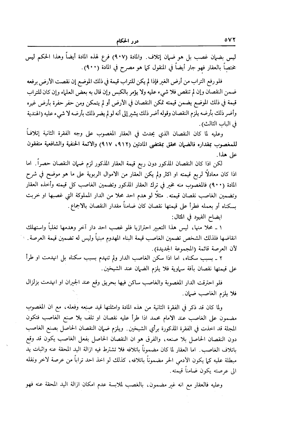 وَعَلَيْهِ لَمَّا كَانَ النُّقْصَانُ الَّذِي يَحْدُثُ فِي الْعَقَارِ الْمَغْصُوبِ عَلَى وَجْهِ الْفِقْرَةِ الثَّانِيَةِ إتْلَافًا لِلْمَغْصُوبِ بِمِقْدَارِهِ فَالضَّمَانُ مُحَقَّقٌ بِمُقْتَضَى الْمَادَّتَيْنِ (912، 917) وَالْأَئِمَّةُ الْحَنَفِيَّةُ وَالشَّافِعِيَّةُ مُتَّفِقُونَ عَلَى هَذَا. لَكِنْ إذَا كَانَ النُّقْصَانُ الْمَذْكُورُ دُونَ رُبْعِ قِيمَةِ الْعَقَارِ الْمَذْكُورِ لَزِمَ ضَمَانُ النُّقْصَانِ حَصْرًا. أَمَّا إذَا كَانَ مُعَادِلًا لِرُبْعِ قِيمَتِهِ أَوْ أَكْثَرَ وَلَمْ يَكُنْ الْعَقَارُ مِنْ الْأَمْوَالِ الرِّبَوِيَّةِ عَلَى مَا هُوَ مُوَضَّحٌ فِي شَرْحِ الْمَادَّةِ (900) فَالْمَغْصُوبُ مِنْهُ مُخَيَّرٌ فِي تَرْكِ الْعَقَارِ الْمَذْكُورِ وَتَضْمِينِ الْغَاصِبِ كُلَّ قِيمَتِهِ وَأَخْذِهِ الْعَقَارَ وَتَضْمِينِ الْغَاصِبِ نُقْصَانَ قِيمَتِهِ. مَثَلًا لَوْ هَدَمَ أَحَدٌ مَحِلًّا مِنْ الدَّارِ الْمَمْلُوكَةِ الَّتِي غَصَبَهَا أَوْ خَرِبَتْ بِسُكْنَاهُ أَوْ بِعَمَلِهِ فَطَرَأَ عَلَى قِيمَتِهَا نُقْصَانٌ كَانَ ضَامِنًا مِقْدَارَ النُّقْصَانِ بِالْإِجْمَاعِ. إيضَاحُ الْقُيُودِ فِي الْمِثَالِ: