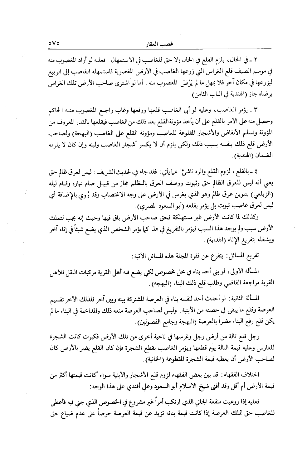 الْمَسْأَلَةُ الثَّانِيَةُ: لَوْ أَحْدَثَ أَحَدٌ لِنَفْسِهِ بِنَاءً فِي الْعَرْصَةِ الْمُشْتَرَكَةِ بَيْنَهُ وَبَيْنَ آخَرَ فَلِذَلِكَ الْآخَرِ تَقْسِيمُ الْعَرْصَةِ وَقَلْعُ مَا يَبْقَى فِي حِصَّتِهِ مِنْ الْأَبْنِيَةِ. وَلَيْسَ لِصَاحِبِ الْعَرْصَةِ مَنْعُهُ ذَلِكَ وَالْمُدَاخَلَةُ فِي الْبِنَاءِ مَا لَمْ يَكُنْ قَلْعُ وَرَفْعُ الْبِنَاءِ مُضِرًّا بِالْعَرْصَةِ (الْبَهْجَةُ وَجَامِعُ الْفُصُولَيْنِ) . رَجُلٌ قَلَعَ تَالَّةً مِنْ أَرْضِ رَجُلٍ وَغَرَسَهَا فِي نَاحِيَةٍ أُخْرَى مِنْ تِلْكَ الْأَرْضِ فَكَبُرَتْ كَانَتْ الشَّجَرَةُ لِلْغَارِسِ وَعَلَيْهِ قِيمَةُ التَّالَّةِ يَوْمَ قَطْعِهَا وَيُؤْمَرُ الْغَاصِبُ بِقَطْعِ الشَّجَرَةِ فَإِنْ كَانَ الْقَلْعُ يَضُرُّ بِالْأَرْضِ كَانَ لِصَاحِبِ الْأَرْضِ أَنْ يُعْطِيَهُ قِيمَةَ الشَّجَرَةِ الْمَقْطُوعَةِ (الْخَانِيَّةُ) . اخْتِلَافُ الْفُقَهَاءِ: قَدْ بَيَّنَ بَعْضُ الْفُقَهَاءِ لُزُومَ قَلْعِ الْأَشْجَارِ وَالْأَبْنِيَةِ سَوَاءٌ أَكَانَتْ قِيمَتُهَا أَكْثَرَ مِنْ قِيمَةِ الْأَرْضِ أَمْ أَقَلَّ وَقَدْ أَفْتَى شَيْخُ الْإِسْلَامِ أَبُو السُّعُودِ وَعَلِيٌّ أَفَنْدِي عَلَى هَذَا الْوَجْهِ: فَعَلَيْهِ إذَا رُوعِيَتْ مَنْفَعَةُ الْجَانِي الَّذِي ارْتَكَبَ أَمْرًا غَيْرَ مَشْرُوعٍ فِي الْخُصُوصِ الَّذِي جَنَى فِيهِ فَأَعْطَى لِلْغَاصِبِ حَقَّ تَمَلُّكِ الْعَرْصَةِ إذَا كَانَتْ قِيمَةُ بِنَائِهِ تَزِيدُ عَنْ قِيمَةِ الْعَرْصَةِ حِرْصًا عَلَى عَدَمِ ضَيَاعِ حَقِّ