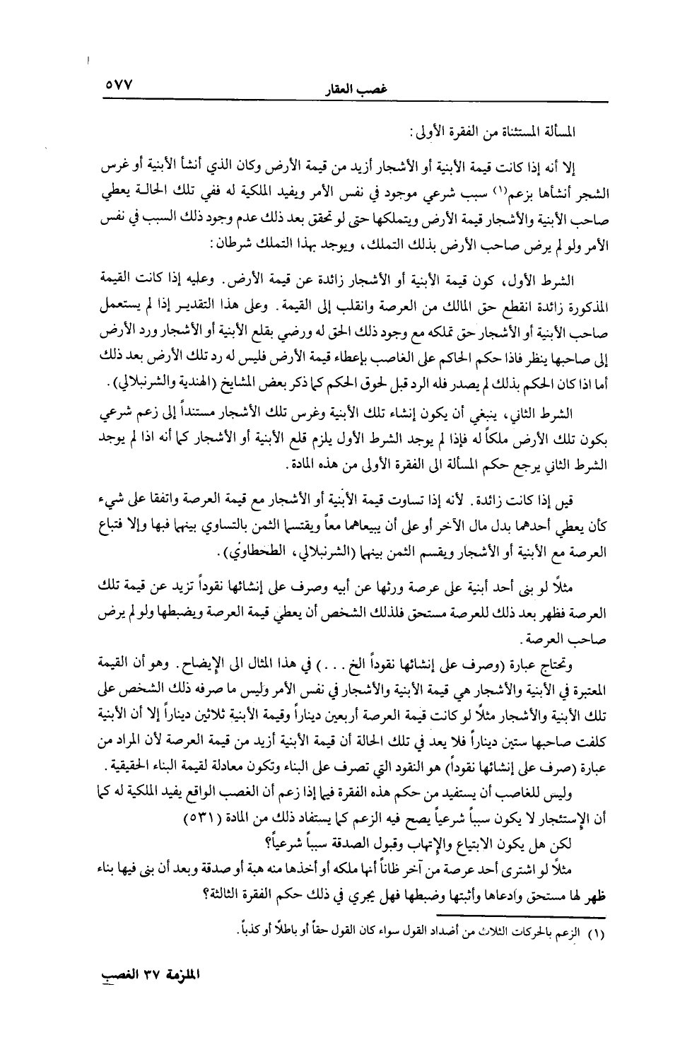 الْمَسْأَلَةُ الْمُسْتَثْنَاةُ مِنْ الْفِقْرَةِ الْأُولَى: إلَّا أَنَّهُ إذَا كَانَتْ قِيمَةُ الْأَبْنِيَةِ أَوْ الْأَشْجَارِ أَزْيَدَ مِنْ قِيمَةِ الْأَرْضِ وَكَانَ الَّذِي أَنْشَأَ الْأَبْنِيَةَ أَوْ غَرَسَ الشَّجَرَ أَنْشَأَهَا بِزَعْمِ سَبَبٍ شَرْعِيٍّ مَوْجُودٍ فِي نَفْسِ الْأَمْرِ وَيُفِيدُ الْمِلْكِيَّةَ لَهُ فَفِي تِلْكَ الْحَالَةِ يُعْطِي صَاحِبُ الْأَبْنِيَةِ وَالْأَشْجَارِ قِيمَةَ الْأَرْضِ وَيَتَمَلَّكُهَا حَتَّى لَوْ تَحَقَّقَ بَعْدَ ذَلِكَ عَدَمُ وُجُودِ ذَلِكَ السَّبَبِ فِي نَفْسِ الْأَمْرِ وَلَوْ لَمْ يَرْضَ صَاحِبُ الْأَرْضِ بِذَلِكَ التَّمَلُّكِ، وَيُوجَدُ بِهَذَا التَّمَلُّكِ شَرْطَانِ: