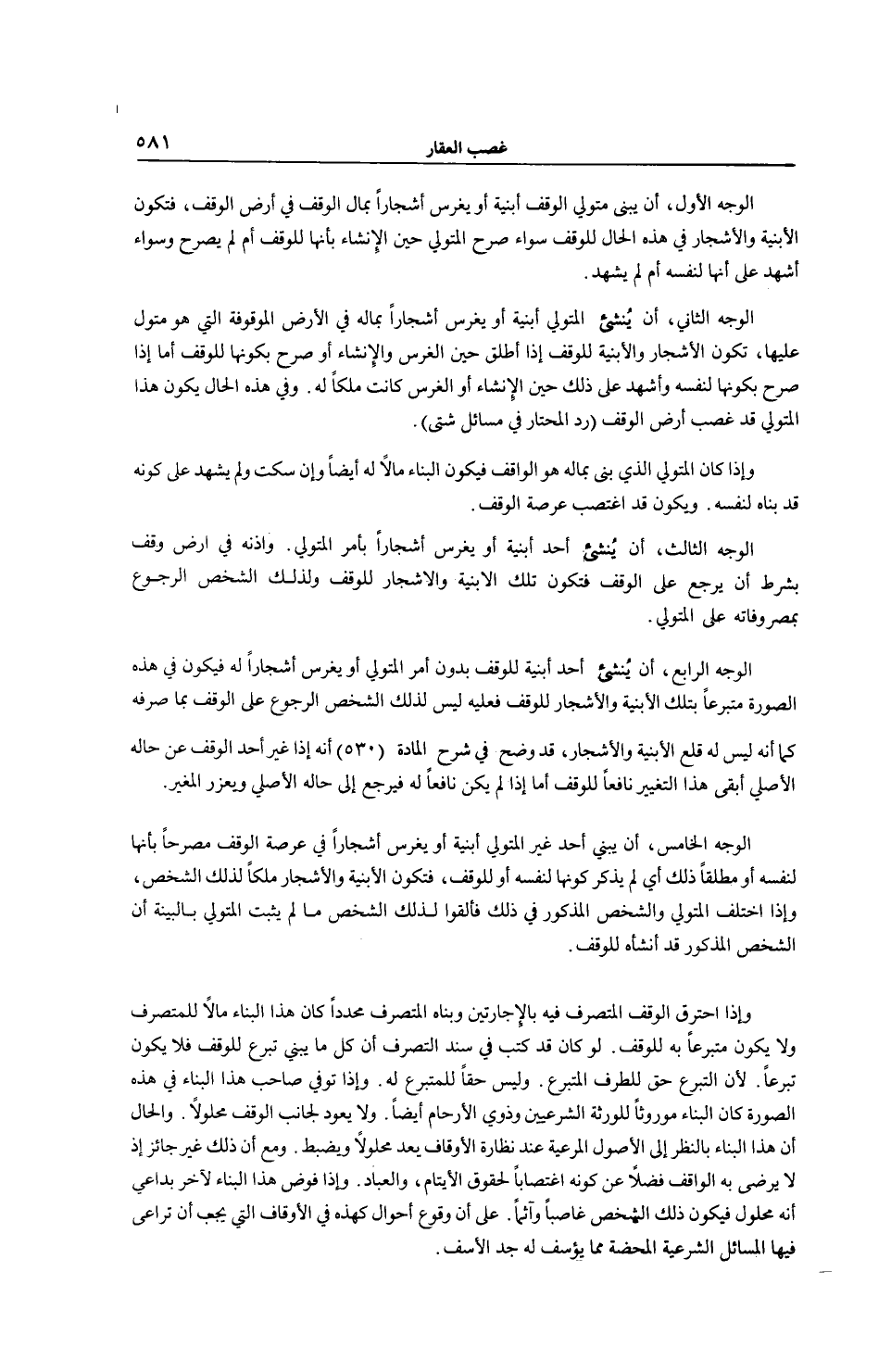 الْوَجْهُ الثَّالِثُ: أَنْ يُنْشِئَ أَحَدٌ أَبْنِيَةً أَوْ يَغْرِسَ أَشْجَارًا بِأَمْرِ الْمُتَوَلِّي. وَإِذْنِهِ فِي أَرْضِ وَقْفٍ بِشَرْطِ أَنْ يَرْجِعَ عَلَى الْوَقْفِ فَتَكُونُ تِلْكَ الْأَبْنِيَةُ وَالْأَشْجَارُ لِلْوَقْفِ وَلِذَلِكَ الشَّخْصِ الرُّجُوعُ بِمَصْرُوفَاتِهِ عَلَى الْمُتَوَلِّي. الْوَجْهُ الرَّابِعُ: أَنْ يُنْشِئَ أَحَدٌ أَبْنِيَةً لِلْوَقْفِ بِدُونِ أَمْرِ الْمُتَوَلِّي أَوْ يَغْرِسَ أَشْجَارًا لَهُ فَيَكُونُ فِي هَذِهِ الصُّورَةِ مُتَبَرِّعًا بِتِلْكَ الْأَبْنِيَةِ وَالْأَشْجَارِ لِلْوَقْفِ فَعَلَيْهِ لَيْسَ لِذَلِكَ الشَّخْصِ الرُّجُوعُ عَلَى الْوَقْفِ بِمَا صَرَفَهُ كَمَا أَنَّهُ لَيْسَ لَهُ قَلْعُ الْأَبْنِيَةِ وَالْأَشْجَارِ، قَدْ وُضِّحَ فِي شَرْحِ الْمَادَّةِ (530) أَنَّهُ إذَا غَيَّرَ أَحَدٌ الْوَقْفَ عَنْ حَالِهِ الْأَصْلِيِّ أُبْقِيَ هَذَا التَّغْيِيرُ إذَا كَانَ نَافِعًا لِلْوَقْفِ أَمَّا إذَا لَمْ يَكُنْ نَافِعًا لَهُ فَيَرْجِعُ إلَى حَالِهِ الْأَصْلِيِّ وَيُعَزَّرُ الْمُغَيِّرُ. الْوَجْهُ الْخَامِسُ: أَنْ يَبْنِيَ أَحَدٌ غَيْرُ الْمُتَوَلِّي أَبْنِيَةً أَوْ يَغْرِسَ أَشْجَارًا فِي عَرْصَةِ الْوَقْفِ مُصَرِّحًا بِأَنَّهَا لِنَفْسِهِ أَوْ مُطْلِقًا ذَلِكَ أَيْ لَمْ يَذْكُرْ كَوْنَهَا لِنَفْسِهِ أَوْ لِلْوَقْفِ، فَتَكُونُ الْأَبْنِيَةُ وَالْأَشْجَارُ مِلْكًا لِذَلِكَ الشَّخْصِ، وَإِذَا اخْتَلَفَ الْمُتَوَلِّي وَالشَّخْصُ الْمَذْكُورُ فِي ذَلِكَ فَالْقَوْلُ لِذَلِكَ الشَّخْصِ مَا لَمْ يُثْبِتْ الْمُتَوَلِّي بِالْبَيِّنَةِ أَنَّ الشَّخْصَ الْمَذْكُورَ قَدْ أَنْشَأَهُ لِلْوَقْفِ. وَإِذَا احْتَرَقَ الْوَقْفُ الْمُتَصَرَّفُ فِيهِ بِالْإِجَارَتَيْنِ وَبَنَاهُ الْمُتَصَرِّفُ مُحَدَّدًا كَانَ هَذَا الْبِنَاءُ مَالًا لِلْمُتَصَرِّفِ وَلَا يَكُونُ مُتَبَرِّعًا بِهِ لِلْوَقْفِ. لَوْ كَانَ قَدْ كُتِبَ فِي سَنَدِ التَّصَرُّفِ أَنَّ كُلَّ مَا يُبْنَى تَبَرُّعٌ لِلْوَقْفِ فَلَا يَكُونُ تَبَرُّعًا. لِأَنَّ التَّبَرُّعَ حَقٌّ لِلطَّرَفِ الْمُتَبَرِّعِ. وَلَيْسَ حَقًّا لِلْمُتَبَرَّعِ لَهُ. وَإِذَا تُوُفِّيَ صَاحِبُ هَذَا الْبِنَاءِ فِي هَذِهِ الصُّورَةِ كَانَ الْبِنَاءُ مَوْرُوثًا لِلْوَرَثَةِ الشَّرْعِيِّينَ وَذَوِي الْأَرْحَامِ أَيْضًا. وَلَا يَعُودُ لِجَانِبِ الْوَقْفِ مَحْلُولًا. وَالْحَالُ أَنَّ هَذَا الْبِنَاءَ بِالنَّظَرِ إلَى الْأُصُولِ الْمَرْعِيَّةِ عِنْدَ نِظَارَةِ الْأَوْقَافِ يُعَدُّ مَحْلُولًا وَيُضْبَطُ. وَمَعَ أَنَّ ذَلِكَ غَيْرُ جَائِزٍ إذْ لَا يَرْضَى بِهِ الْوَاقِفُ فَضْلًا عَنْ كَوْنِهِ اغْتِصَابًا لِحُقُوقِ الْأَيْتَامِ، وَالْعِبَادِ.