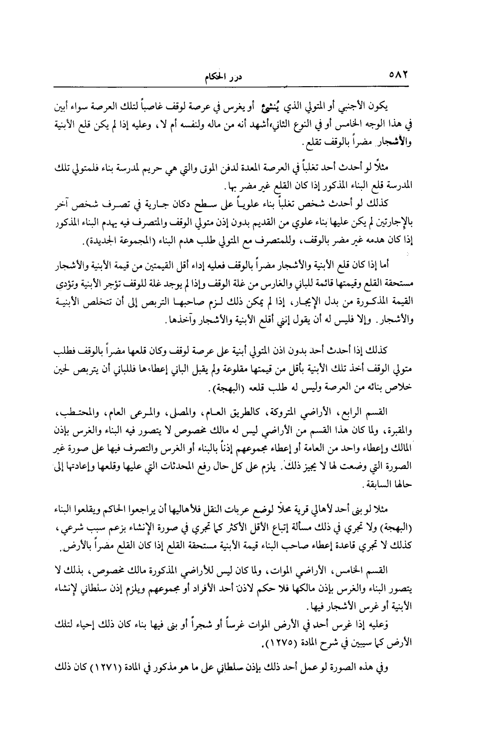 الْقِسْمُ الرَّابِعُ: الْأَرَاضِي الْمَتْرُوكَةُ، كَالطَّرِيقِ الْعَامِ، وَالْمُصَلَّى، وَالْمَرْعَى الْعَامِ، وَالْمُحْتَطَبِ، وَالْمَقْبَرَةِ، وَلَمَّا كَانَ هَذَا الْقِسْمُ مِنْ الْأَرَاضِي لَيْسَ لَهُ مَالِكٌ مَخْصُوصٌ لَا يُتَصَوَّرُ فِيهِ الْبِنَاءُ وَالْغَرْسُ بِإِذْنِ الْمَالِكِ وَإِعْطَاءُ وَاحِدٍ مِنْ الْعَامَّةِ أَوْ إعْطَاءُ مَجْمُوعِهِمْ إذْنًا بِالْبِنَاءِ أَوْ الْغَرْسِ وَالتَّصَرُّفِ فِيهَا عَلَى صُورَةٍ غَيْرِ الصُّورَةِ الَّتِي وُضِعَتْ لَهَا لَا يُجِيزُ ذَلِكَ. يَلْزَمُ عَلَى كُلِّ حَالٍ رَفْعُ الْمُحْدَثَاتِ الَّتِي عَلَيْهَا وَقَلْعُهَا وَإِعَادَتُهَا إلَى حَالِهَا السَّابِقَةِ. مَثَلًا لَوْ بَنَى أَحَدٌ لِأَهَالِي قَرْيَةٍ مَحِلًّا لِوَضْعِ عَرَبَاتِ النَّقْلِ فَلِأَهَالِيِهَا أَنْ يُرَاجِعُوا الْحَاكِمَ وَيَقْلَعُوا الْبِنَاءَ (الْبَهْجَةُ) وَلَا تَجْرِي فِي ذَلِكَ مَسْأَلَةُ إتْبَاعِ الْأَقَلِّ الْأَكْثَرَ كَمَا تَجْرِي فِي صُورَةِ الْإِنْشَاءِ بِزَعْمِ سَبَبٍ شَرْعِيٍّ، كَذَلِكَ لَا تَجْرِي قَاعِدَةُ إعْطَاءِ صَاحِبِ الْبِنَاءِ قِيمَةَ الْأَبْنِيَةِ مُسْتَحَقَّةِ الْقَلْعِ إذَا كَانَ الْقَلْعُ مُضِرًّا بِالْأَرْضِ.