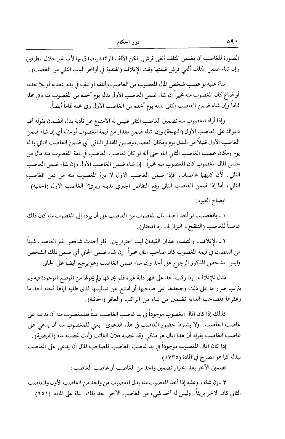 1 - بِالْغَصْبِ، لَوْ أَخَذَ أَحَدٌ الْمَالَ الْمَغْصُوبَ مِنْ الْغَاصِبِ عَلَى أَنْ يَرُدَّهُ إلَى الْمَغْصُوبِ مِنْهُ كَانَ ذَلِكَ غَاصِبًا لِلْغَاصِبِ (التَّنْقِيحُ، الْبَزَّازِيَّةُ، رَدُّ الْمُحْتَارِ) . 2 - الْإِتْلَافُ، وَالتَّلَفُ، هَذَانِ الْقَيْدَانِ لَيْسَا احْتِرَازِيَّيْنِ. فَلَوْ أَحْدَثَ شَخْصٌ غَيْرُ الْغَاصِبِ شَيْئًا مِنْ النُّقْصَانِ فِي قِيمَةِ الْمَغْصُوبِ كَانَ صَاحِبُ الْمَالِ مُخَيَّرًا. إنْ شَاءَ ضَمَّنَ الْجَانِي أَيْ ضَمَّنَ ذَلِكَ الشَّخْصَ وَلَيْسَ لِلشَّخْصِ الْمَذْكُورِ الرُّجُوعُ عَلَى أَحَدٍ وَإِنْ شَاءَ ضَمَّنَ الْغَاصِبَ وَهُوَ يَرْجِعُ أَيْضًا عَلَى الْجَانِي. مِثَالٌ لِلْإِتْلَافِ: إذَا رَكِبَ أَحَدٌ عَلَى ظَهْرِ دَابَّةِ غَيْرِهِ فَلَمْ يُحَرِّكْهَا وَلَمْ يُحَوِّلْهَا مِنْ الْمَوْضِعِ الْمَوْجُودَةِ فِيهِ وَلَمْ يَتَرَتَّبْ ضَرَرٌ مَا عَلَى ذَلِكَ وَجَحَدَهَا عَلَى صَاحِبِهَا أَوْ امْتَنَعَ عَنْ تَسْلِيمِهَا لَدَى طَلَبِهِ إيَّاهَا فَجَاءَ أَحَدٌ مَا وَعَقَرَهَا فَلِصَاحِبِ الدَّابَّةِ تَضْمِينُ مَنْ شَاءَ مِنْ الرَّاكِبِ وَالْعَاقِرِ (الْخَانِيَّةُ) .