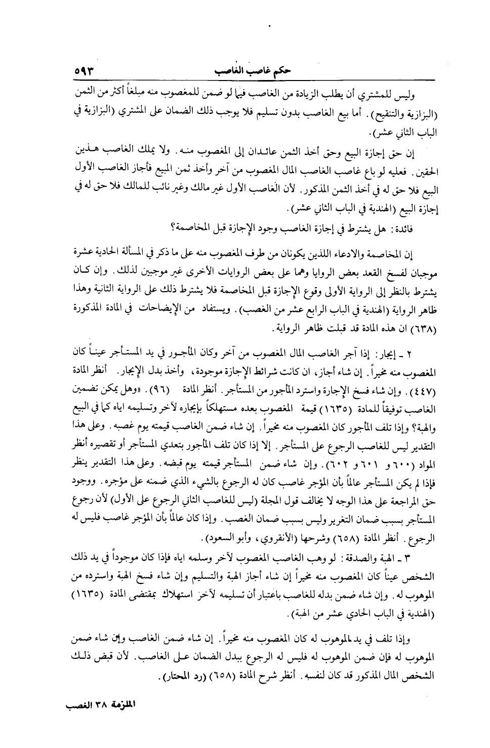 وَيُسْتَفَادُ مِنْ الْإِيضَاحَاتِ فِي الْمَادَّةِ الْمَذْكُورَةِ (638) أَنَّ هَذِهِ الْمَادَّةَ قَدْ قَبِلَتْ ظَاهِرَ الرِّوَايَةِ. 2 - إيجَارٌ: إذَا أَجَّرَ الْغَاصِبُ الْمَالَ الْمَغْصُوبَ مِنْ آخَرَ وَكَانَ الْمَأْجُورُ فِي يَدِ الْمُسْتَأْجِرِ عَيْنًا كَانَ الْمَغْصُوبُ مِنْهُ مُخَيَّرًا. إنْ شَاءَ أَجَازَ، إنْ كَانَتْ شَرَائِطُ الْإِجَازَةِ مَوْجُودَةً، وَأَخَذَ بَدَلَ الْإِيجَارِ. اُنْظُرْ الْمَادَّةَ (447) . وَإِنْ شَاءَ فَسَخَ الْإِجَارَةَ وَاسْتَرَدَّ الْمَأْجُورَ مِنْ الْمُسْتَأْجِرِ. اُنْظُرْ الْمَادَّةَ (96) . وَهَلْ يُمْكِنُ تَضْمِينُ الْغَاصِبِ تَوْفِيقًا لِلْمَادَّةِ (1635) قِيمَةُ الْمَغْصُوبِ بَعْدَهُ مُسْتَهْلَكًا بِإِيجَارِهِ لِآخَرَ وَتَسْلِيمِهِ إيَّاهُ كَمَا فِي الْبَيْعِ وَالْهِبَةِ؟ وَإِذَا تَلَفَ الْمَأْجُورُ كَانَ الْمَغْصُوبُ مِنْهُ مُخَيَّرًا. إنْ شَاءَ ضَمَّنَ الْغَاصِبَ قِيمَتَهُ يَوْمَ غَصْبِهِ. وَعَلَى هَذَا التَّقْدِيرِ لَيْسَ لِلْغَاصِبِ الرُّجُوعُ عَلَى الْمُسْتَأْجِرِ. إلَّا إذَا كَانَ تَلَفَ الْمَأْجُورُ بِتَعَدِّي الْمُسْتَأْجِرِ أَوْ تَقْصِيرِهِ اُنْظُرْ الْمَوَادَّ (600 و 601 و 602) . وَإِنْ شَاءَ ضَمَّنَ الْمُسْتَأْجِرَ قِيمَتَهُ يَوْمَ قَبْضِهِ. وَعَلَى هَذَا التَّقْدِيرِ يُنْظَرُ فَإِذَا لَمْ يَكُنْ الْمُسْتَأْجِرُ عَالِمًا بِأَنَّ الْمُؤَجِّرَ غَاصِبٌ كَانَ لَهُ الرُّجُوعُ بِالشَّيْءِ الَّذِي ضَمِنَهُ عَلَى مُؤَجِّرِهِ. وَوُجُودُ حَقِّ الْمُرَاجَعَةِ عَلَى هَذَا الْوَجْهِ لَا يُخَالِفُ قَوْلَ الْمَجَلَّةِ (لَيْسَ لِلْغَاصِبِ الثَّانِي الرُّجُوعُ عَلَى الْأَوَّلِ) لِأَنَّ رُجُوعَ الْمُسْتَأْجِرِ بِسَبَبِ ضَمَانِ التَّغْرِيرِ وَلَيْسَ بِسَبَبِ ضَمَانِ الْغَصْبِ. وَإِذَا كَانَ عَالِمًا بِأَنَّ الْمُؤَجِّرَ غَاصِبٌ فَلَيْسَ لَهُ الرُّجُوعُ. اُنْظُرْ الْمَادَّةَ (658) وَشَرْحَهَا (الْأَنْقِرْوِيُّ، وَأَبُو السُّعُودِ) .