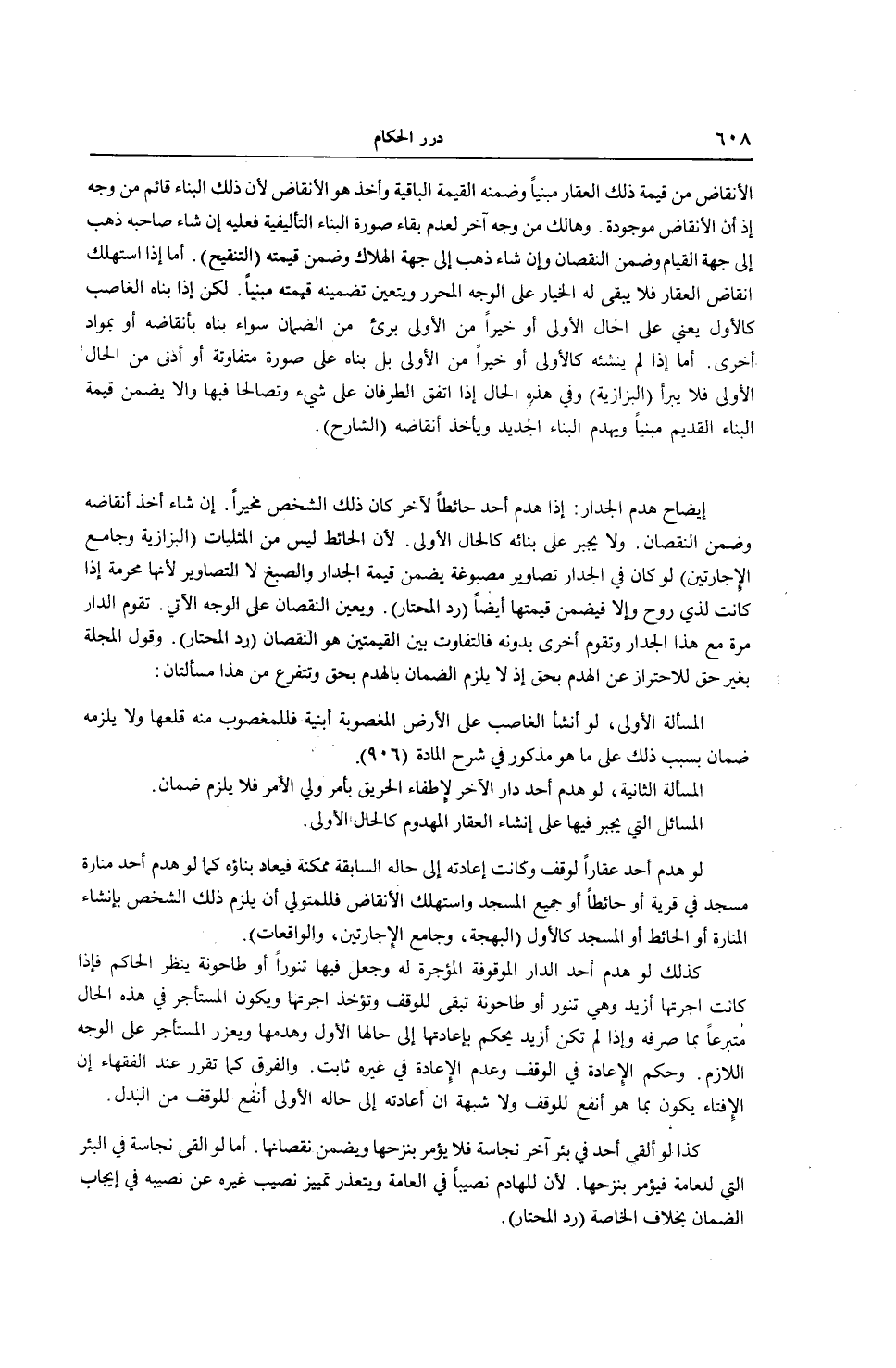 إيضَاحُ هَدْمِ الْجِدَارِ: إذَا هَدَمَ أَحَدٌ حَائِطًا لِآخَرَ كَانَ ذَلِكَ الشَّخْصُ مُخَيَّرًا إنْ شَاءَ أَخَذَ أَنْقَاضَهُ وَضَمِنَ النُّقْصَانَ، وَلَا يُجْبَرُ عَلَى بِنَائِهِ كَالْحَالِ الْأُولَى؛ لِأَنَّ الْحَائِطَ لَيْسَ مِنْ الْمِثْلِيَّاتِ (الْبَزَّازِيَّةُ وَجَامِعُ الْإِجَارَتَيْنِ) لَوْ كَانَ فِي الْجِدَارِ تَصَاوِيرُ مَصْبُوغَةٌ يَضْمَنُ قِيمَةَ الْجِدَارِ وَالصَّبْغِ لَا التَّصَاوِيرِ؛ لِأَنَّهَا مُحَرَّمَةٌ إذَا كَانَتْ لِذِي رُوحٍ وَإِلَّا فَيَضْمَنُ قِيمَتَهَا أَيْضًا (رَدُّ الْمُحْتَارِ) .