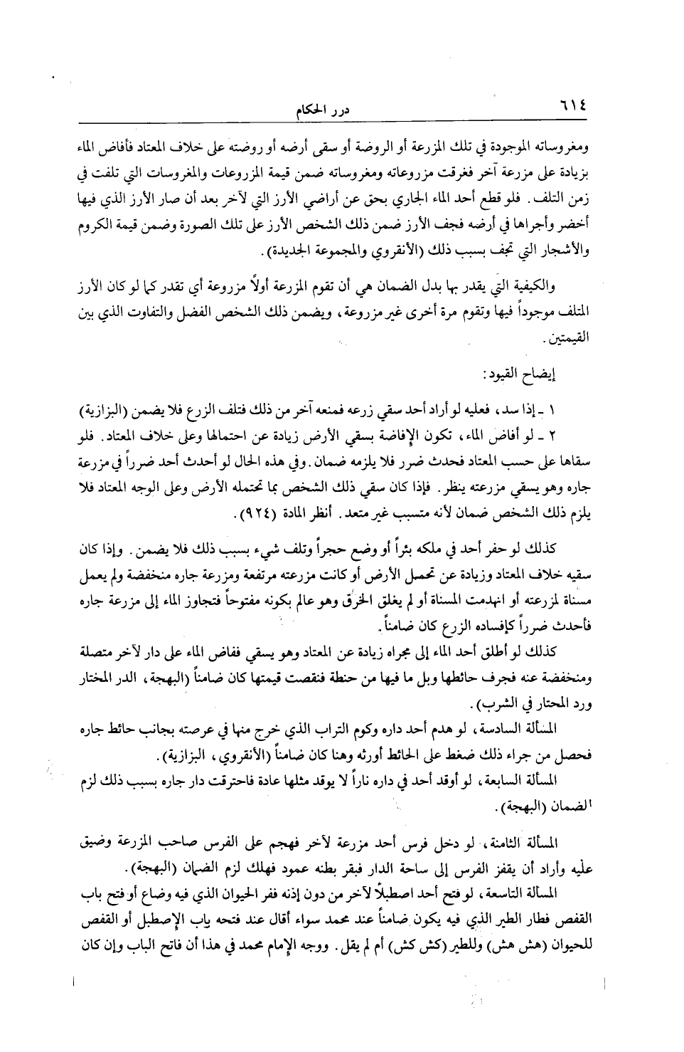 وَفِي هَذِهِ الْحَالِ لَوْ أَحْدَثَ أَحَدٌ ضَرَرًا فِي مَزْرَعَةِ جَارِهِ وَهُوَ يَسْقِي مَزْرَعَتَهُ يُنْظَرُ فَإِذَا كَانَ سَقْيُ ذَلِكَ الشَّخْصِ بِمَا تَحْتَمِلُهُ الْأَرْضُ وَعَلَى الْوَجْهِ الْمُعْتَادِ؛ فَلَا يَلْزَمُ ذَلِكَ الشَّخْصَ ضَمَانٌ؛ لِأَنَّهُ مُتَسَبِّبٌ غَيْرُ مُتَعَدٍّ.