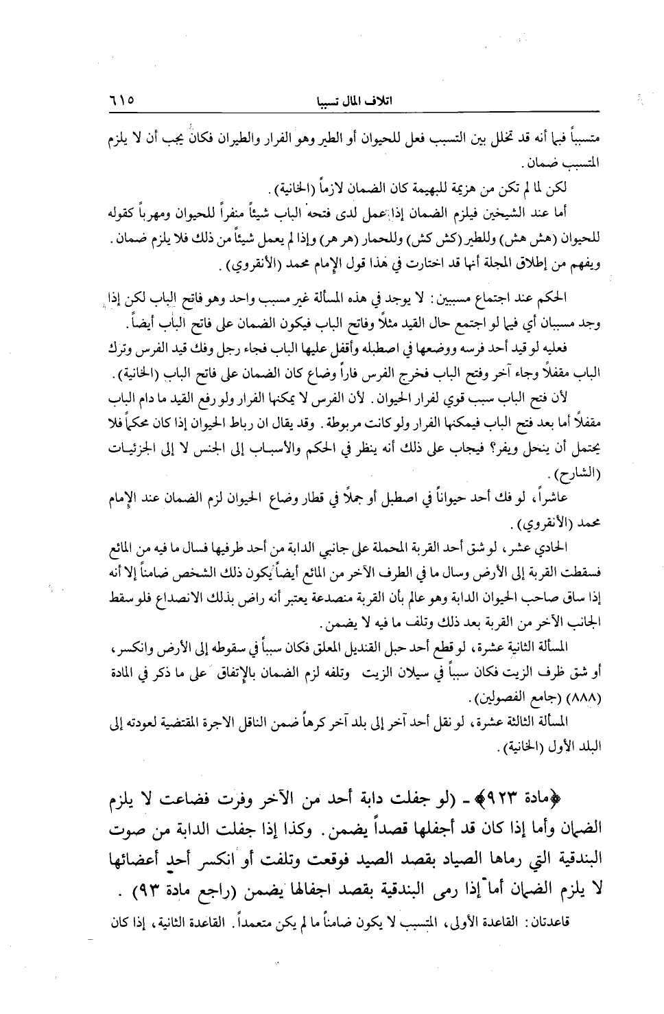 فَعَلَيْهِ: لَوْ قَيَّدَ أَحَدٌ فَرَسَهُ وَوَضَعَهَا فِي إصْطَبْلِهِ وَأَقْفَلَ عَلَيْهَا الْبَابَ فَجَاءَ رَجُلٌ وَفَكَّ قَيْدَ الْفَرَسِ وَتَرَكَ الْبَابَ مُقْفَلًا وَجَاءَ آخَرُ وَفَتَحَ الْبَابَ فَخَرَجَ الْفَرَسُ فَارًّا وَضَاعَ؛ كَانَ الضَّمَانُ عَلَى فَاتِحِ الْبَابِ (الْخَانِيَّةُ) ؛ لِأَنَّ فَتْحَ الْبَابِ سَبَبٌ قَوِيٌّ لِفِرَارِ الْحَيَوَانِ؛ لِأَنَّ الْفَرَسَ لَا يُمْكِنُهَا الْفِرَارُ وَلَوْ رُفِعَ الْقَيْدُ مَا دَامَ الْبَابُ مُقْفَلًا أَمَّا بَعْدَ فَتْحِ الْبَابِ فَيُمْكِنُهَا الْفِرَارُ وَلَوْ كَانَتْ مَرْبُوطَةً.