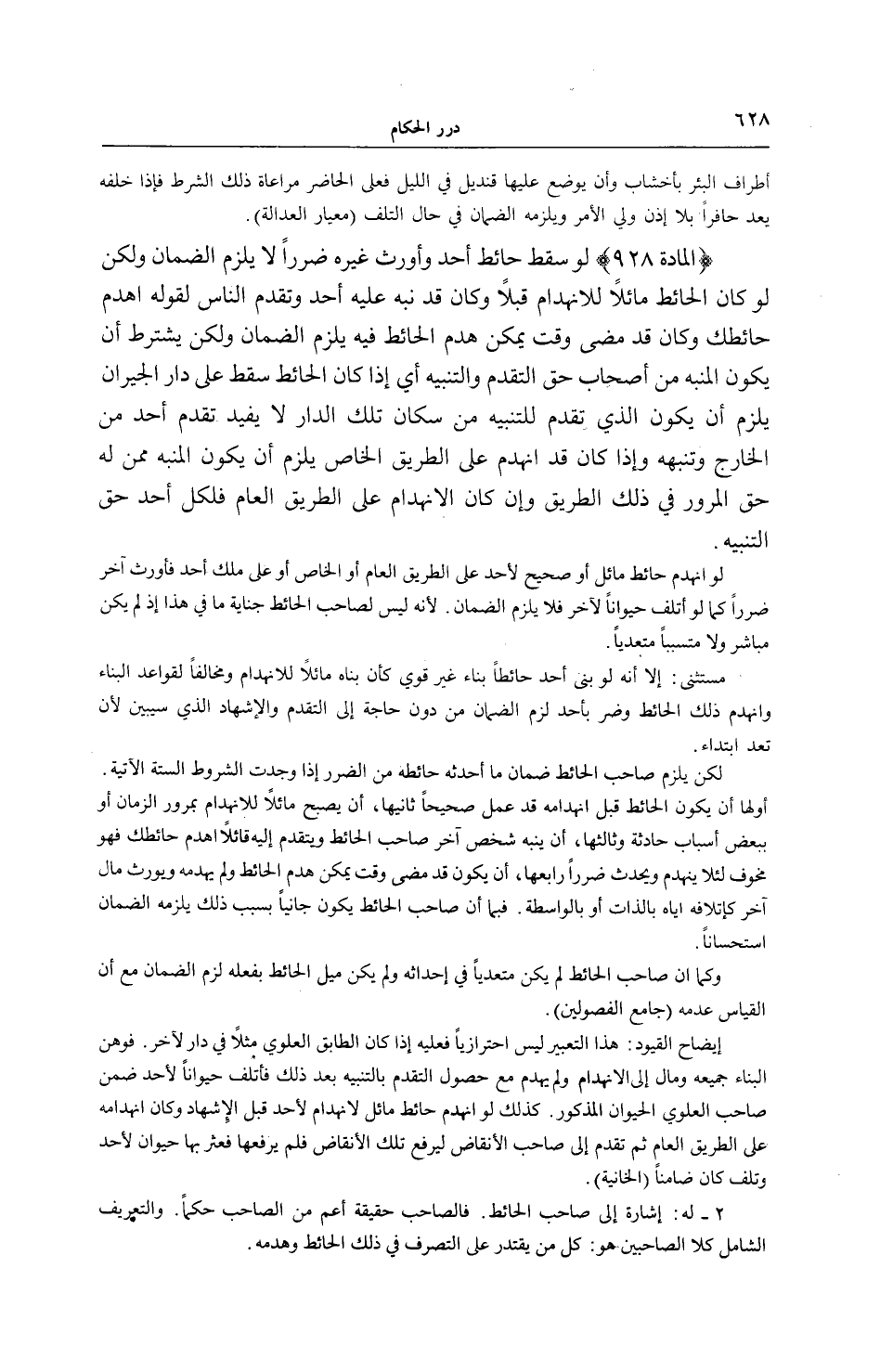 (الْمَادَّةُ 928) لَوْ سَقَطَ حَائِطُ أَحَدٍ وَأَوْرَثَ غَيْرَهُ ضَرَرًا لَا يَلْزَمُ الضَّمَانُ وَلَكِنْ لَوْ كَانَ الْحَائِطُ مَائِلًا لِلِانْهِدَامِ قَبْلًا وَكَانَ قَدْ نَبَّهَ عَلَيْهِ أَحَدٌ وَتَقَدَّمَ النَّاسُ لِقَوْلِهِ اهْدِمْ حَائِطَكَ وَكَانَ قَدْ مَضَى وَقْتٌ يُمْكِنُ هَدْمُ الْحَائِطِ فِيهِ يَلْزَمُ الضَّمَانُ وَلَكِنْ يُشْتَرَطُ أَنْ يَكُونَ الْمُنَبِّهُ مِنْ أَصْحَابِ حَقِّ التَّقَدُّمِ وَالتَّنْبِيهِ أَيْ: إذَا كَانَ الْحَائِطُ سَقَطَ عَلَى دَارِ الْجِيرَانِ يَلْزَمُ أَنْ يَكُونَ الَّذِي تَقَدَّمَ لِلتَّنْبِيهِ مِنْ سُكَّانِ تِلْكَ الدَّارِ لَا يُفِيدُ تَقَدُّمُ أَحَدٍ مِنْ الْخَارِجِ وَتَنَبُّهُهُ وَإِذَا كَانَ قَدْ انْهَدَمَ عَلَى الطَّرِيقِ الْخَاصِّ يَلْزَمُ أَنْ يَكُونَ الْمُنَبِّهُ مِمَّنْ لَهُ حَقُّ الْمُرُورِ فِي ذَلِكَ الطَّرِيقِ وَإِنْ كَانَ الِانْهِدَامُ عَلَى الطَّرِيقِ الْعَامِّ فَلِكُلِّ أَحَدٍ حَقُّ التَّنْبِيهِ.