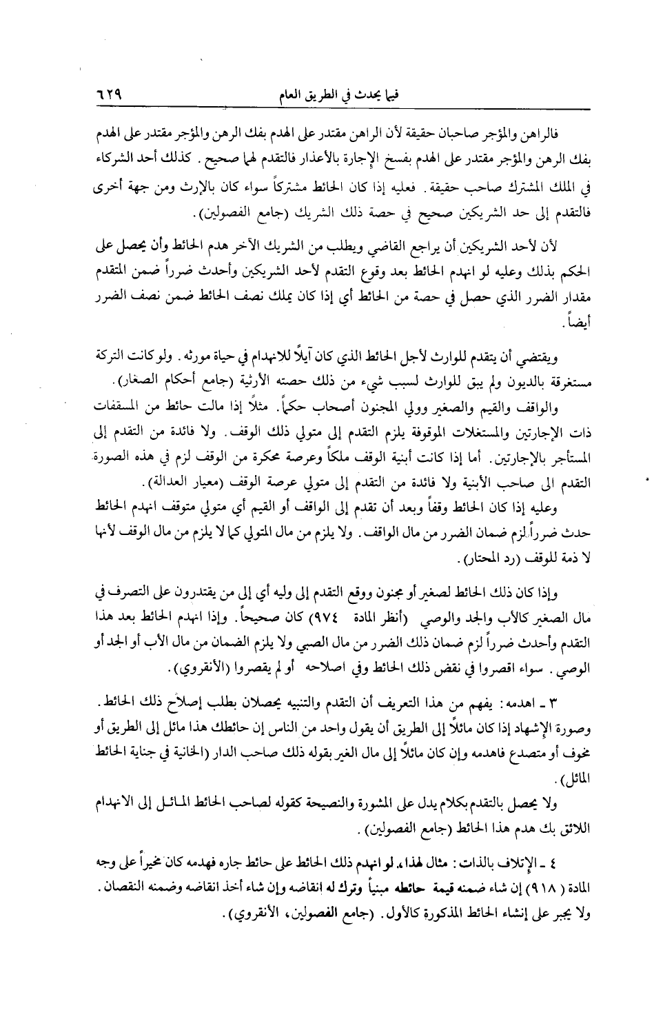 فَعَلَيْهِ إذَا كَانَ الْحَائِطُ مُشْتَرَكًا سَوَاءٌ كَانَ بِالْإِرْثِ وَمِنْ جِهَةٍ أُخْرَى فَالتَّقَدُّمُ إلَى حَدِّ الشَّرِيكَيْنِ صَحِيحٌ فِي حِصَّةِ ذَلِكَ الشَّرِيكِ (جَامِعُ الْفُصُولَيْنِ) ؛ لِأَنَّ لِأَحَدِ الشَّرِيكَيْنِ أَنْ يُرَاجِعَ الْقَاضِيَ وَيَطْلُبَ مِنْ الشَّرِيكِ الْآخَرِ هَدْمَ الْحَائِطِ وَأَنْ يَحْصُلَ عَلَى الْحُكْمِ بِذَلِكَ وَعَلَيْهِ لَوْ انْهَدَمَ الْحَائِطُ بَعْدَ وُقُوعِ التَّقَدُّمِ لِأَحَدِ الشَّرِيكَيْنِ وَأَحْدَثَ ضَرَرًا ضَمِنَ الْمُتَقَدِّمُ مِقْدَارَ الضَّرَرِ الَّذِي حَصَلَ فِي حِصَّتِهِ مِنْ الْحَائِطِ أَيْ: إذَا كَانَ يَمْلِكُ نِصْفَ الْحَائِطِ ضَمِنَ نِصْفَ الضَّرَرِ أَيْضًا.