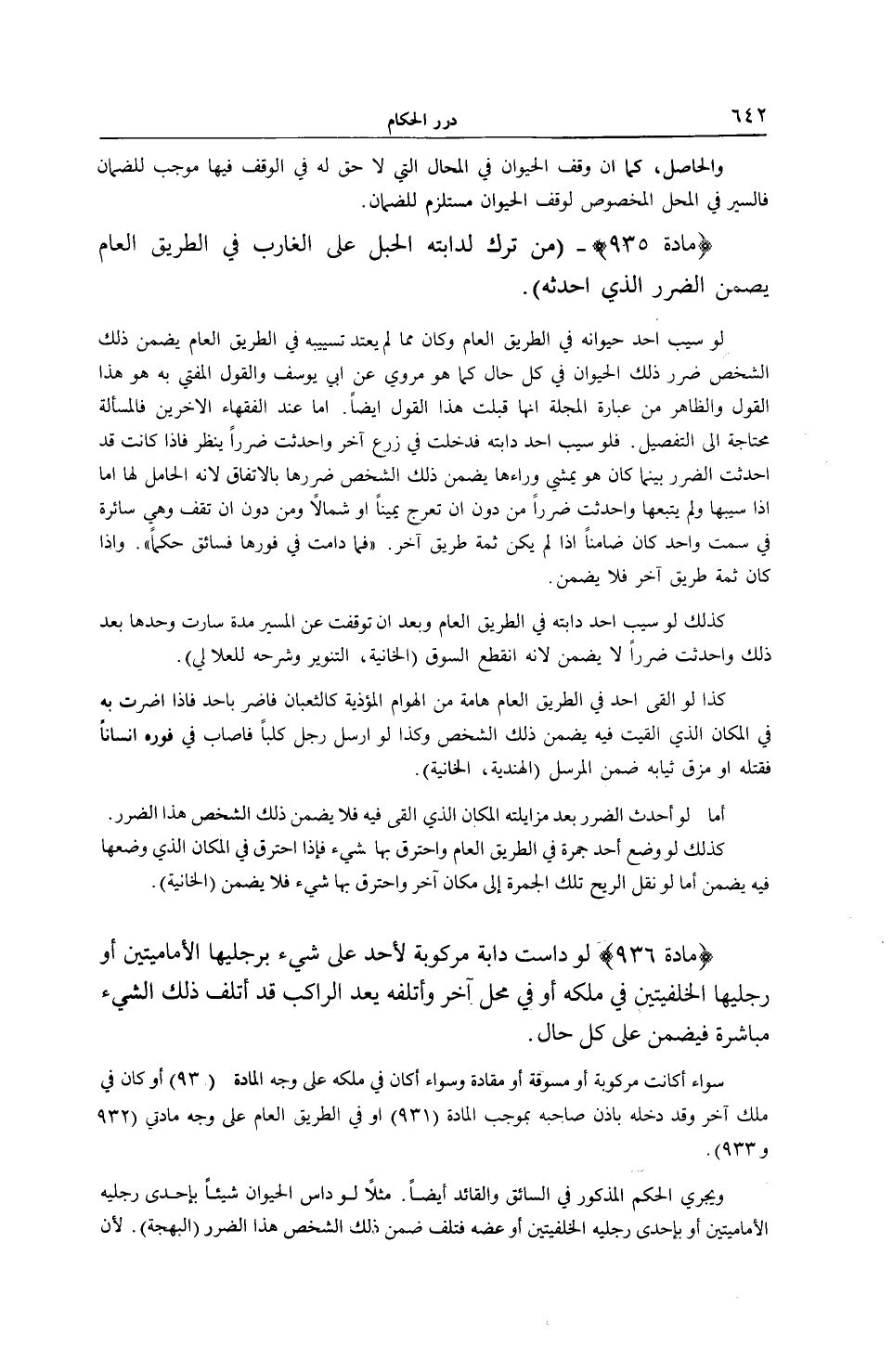(مَادَّةُ 935) - (مَنْ تَرَكَ لِدَابَّتِهِ الْحَبْلَ عَلَى الْغَارِبِ فِي الطَّرِيقِ الْعَامِّ يَضْمَنُ الضَّرَرَ الَّذِي أَحْدَثَهُ) .