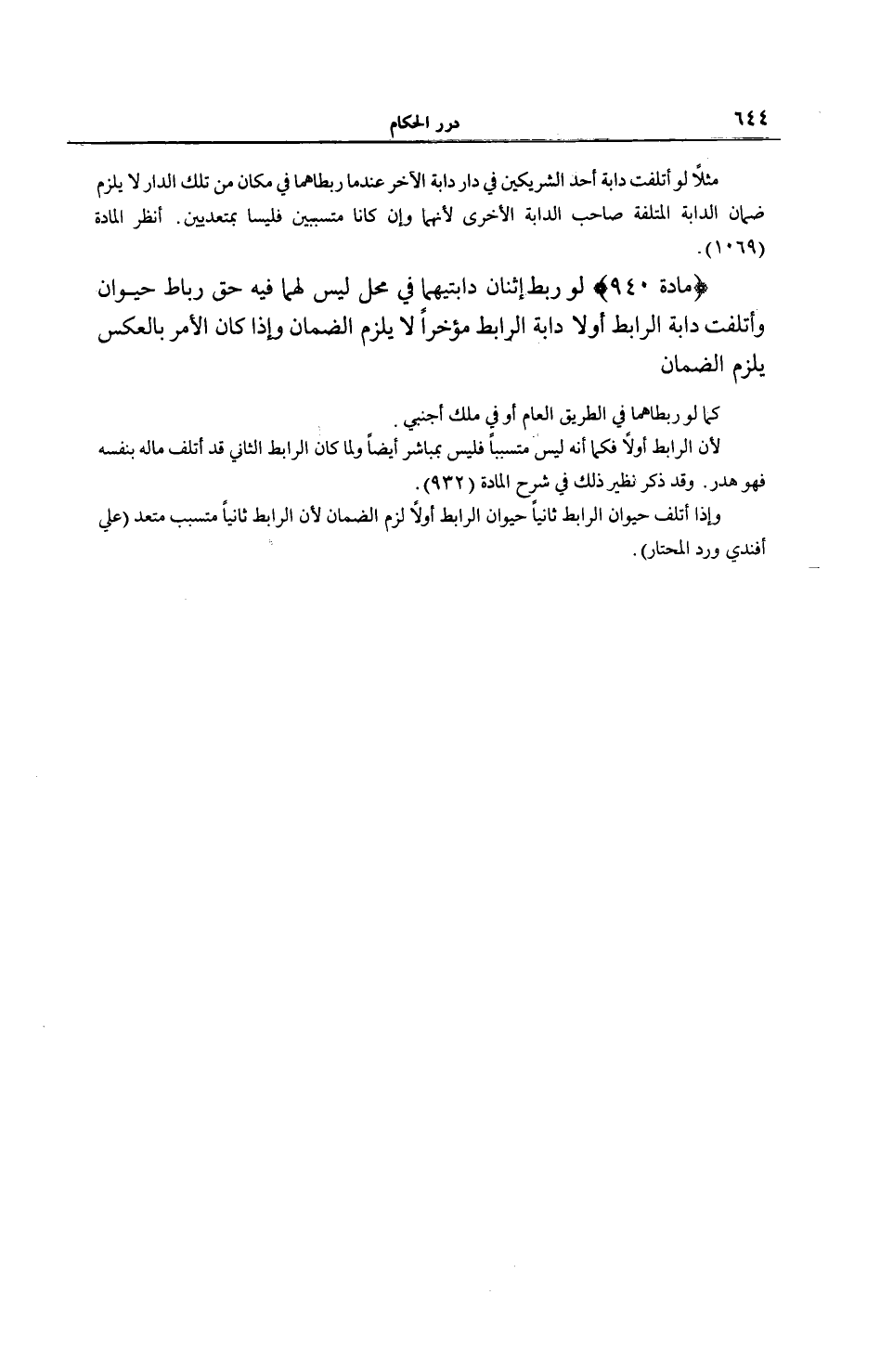 وَقَدْ ذُكِرَ نَظِيرُ ذَلِكَ فِي شَرْجِ الْمَادَّةِ (932) وَإِذَا أَتْلَفَ حَيَوَانُ الرَّابِطِ ثَانِيًا حَيَوَانَ الرَّابِطِ أَوَّلًا لَزِمَ الضَّمَانُ؛ لِأَنَّ الرَّابِطَ ثَانِيًا مُتَسَبِّبٌ مُتَعَدٍّ (عَلِيٌّ أَفَنْدِي وَرَدُّ الْمُحْتَارِ) .