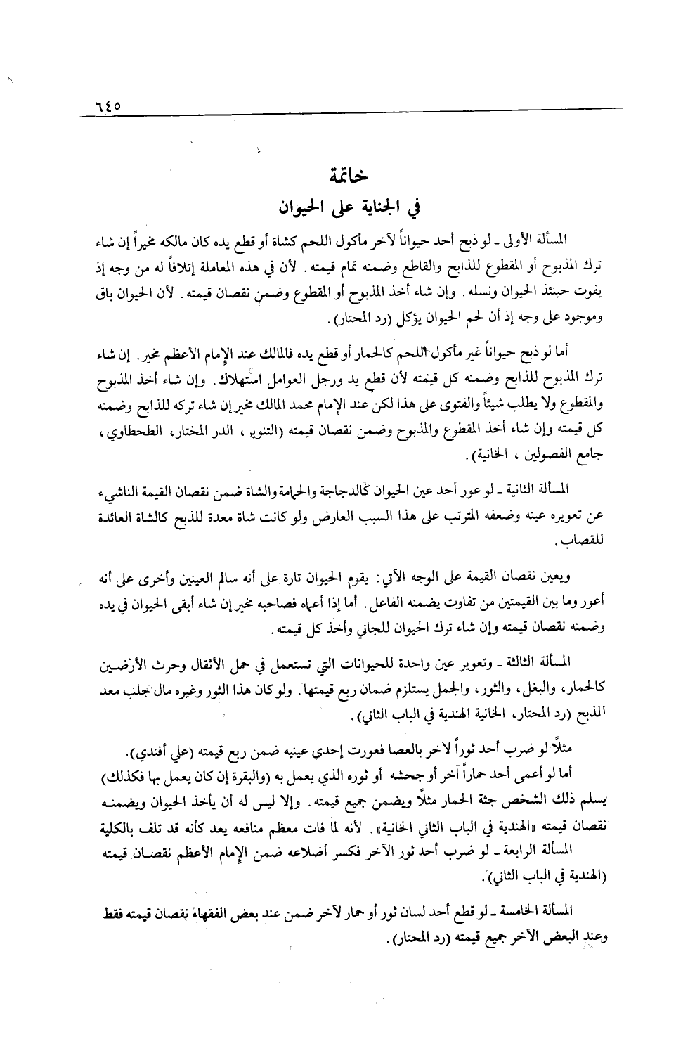 الْمَسْأَلَةُ الْخَامِسَةُ: لَوْ قَطَعَ أَحَدٌ لِسَانَ ثَوْرٍ أَوْ حِمَارٍ لِآخَرَ ضَمِنَ عِنْدَ بَعْضِ الْفُقَهَاءِ نُقْصَانَ قِيمَتِهِ فَقَطْ وَعِنْدَ الْبَعْضِ الْآخَرِ جَمِيعَ قِيمَتِهِ (رَدُّ الْمُحْتَارِ) .