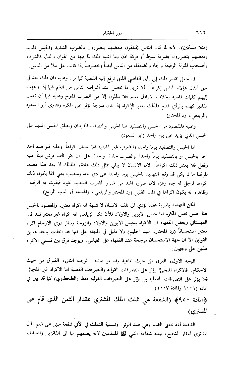 وَعَلَيْهِ فَالْمَقْصُودُ مِنْ الْحَبْسِ وَالتَّصْفِيدِ هُنَا الْحَبْسُ وَالتَّصْفِيدُ الْمَدِيدَانِ وَيُطْلَقُ الْحَبْسُ الْمَدِيدُ عَلَى الْحَبْسِ الَّذِي يَزِيدُ عَلَى يَوْمٍ وَاحِدٍ (أَبُو السُّعُودِ) أَمَّا الْحَبْسُ وَالتَّصْفِيدُ يَوْمًا وَاحِدًا وَالضَّرْبُ غَيْرُ الشَّدِيدِ فَلَا يُعَدَّانِ إكْرَاهًا وَعَلَيْهِ فَلَوْ هَدَّدَ أَحَدٌ آخَرَ بِالْحَبْسِ أَوْ بِالتَّصْفِيدِ يَوْمًا وَاحِدًا وَالضَّرْبِ جَلْدَةً وَاحِدَةً عَلَى أَنْ يُقِرَّ بِأَلْفِ قِرْشٍ دَيْنًا عَلَيْهِ وَفَعَلَ فَلَا يُعْتَبَرُ ذَلِكَ إكْرَاهًا؛ لِأَنَّ الْإِنْسَانَ لَا يُبَالِي بِمِثْلِ ذَلِكَ عَادَةً، فَلِذَلِكَ لَا يُعَدُّ هَذَا مُعْدِمًا لِلرِّضَا مَا لَمْ يَكُنْ قَدْ وَقَعَ التَّهْدِيدُ بِالْحَبْسِ يَوْمًا وَاحِدًا عَلَى ذِي جَاهٍ وَمَنْصِبٍ يَعْنِي: إنَّمَا يَكُونُ ذَلِكَ إكْرَاهًا لِرَجُلٍ لَهُ جَاهٌ وَعِزَّةٌ؛ لِأَنَّ ضَرَرَهُ أَشَدُّ مِنْ ضَرَرِ الضَّرْبِ الشَّدِيدِ لِغَيْرِهِ فَيَفُوتُ بِهِ الرِّضَا وَظَاهِرُهُ أَنَّهُ يَكُونُ إكْرَاهًا فِي الْمَالِ الْقَلِيلِ (رَدُّ الْمُحْتَارِ وَالزَّيْلَعِيّ، وَالْهِنْدِيَّةُ فِي الْبَابِ الرَّابِعِ) لَكِنَّ التَّهْدِيدَ بِضَرْبَةِ عَصَا تُؤَدِّي إلَى تَلَفِ الْإِنْسَانِ لَا شُبْهَةَ أَنَّهُ إكْرَاهٌ مُعْتَبَرٌ، وَالْمَقْصُودُ بِالْحَبْسِ هُنَا حَبْسُ نَفْسِ الْمُكْرَهِ أَمَّا حَبْسُ الْأَبَوَيْنِ وَالْأَوْلَادِ فَإِنْ ذَكَرَ الزَّيْلَعِيّ أَنَّهُ إكْرَاهٌ غَيْرُ مُعْتَبَرٍ فَقَدْ قَالَ الْقُهُسْتَانِيُّ وَبَعْضُ الْفُقَهَاءِ: إنَّ الْإِكْرَاهَ بِحَبْسِ الْأَبَوَيْنِ وَالْأَوْلَادِ وَالزَّوْجَةِ وَسَائِرِ ذَوِي الْأَرْحَامِ إكْرَاهٌ مُعْتَبَرٌ اسْتِحْسَانًا (رَدُّ الْمُحْتَارِ، عَبْدُ الْحَلِيمِ) وَلَا دَلِيلَ فِي الْمَجَلَّةِ عَلَى أَنَّهَا قَدْ أَخَذَتْ بِأَحَدِ هَذَيْنِ الْقَوْلَيْنِ إلَّا أَنَّ جِهَةَ الِاسْتِحْسَانِ مُرَجَّحَةٌ عِنْدَ الْفُقَهَاءِ عَلَى الْقِيَاسِ وَيُوجَدُ فَرْقٌ بَيْنَ قِسْمَيْ الْإِكْرَاهِ هَذَيْنِ عَلَى وَجْهَيْنِ: