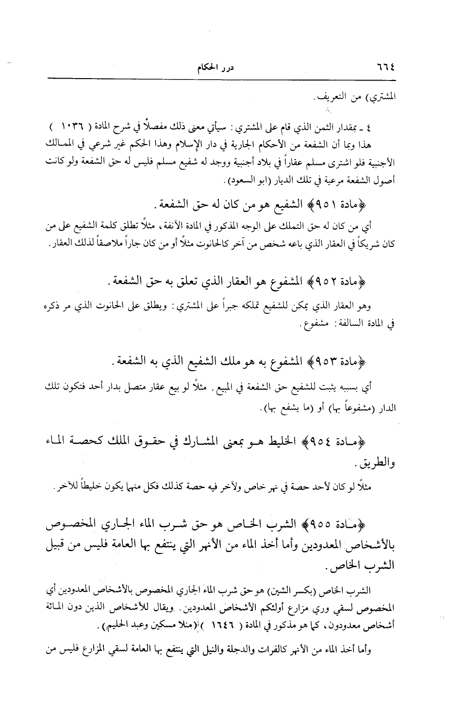 (مَادَّةُ 955) الشِّرْبُ الْخَاصُّ هُوَ حَقُّ شُرْبِ الْمَاءِ الْجَارِي الْمَخْصُوصِ بِالْأَشْخَاصِ الْمَعْدُودِينَ وَأَمَّا أَخْذُ الْمَاءِ مِنْ الْأَنْهُرِ الَّتِي يَنْتَفِعُ بِهَا الْعَامَّةُ؛ فَلَيْسَ مِنْ قَبِيلِ الشُّرْبِ الْخَاصِّ.