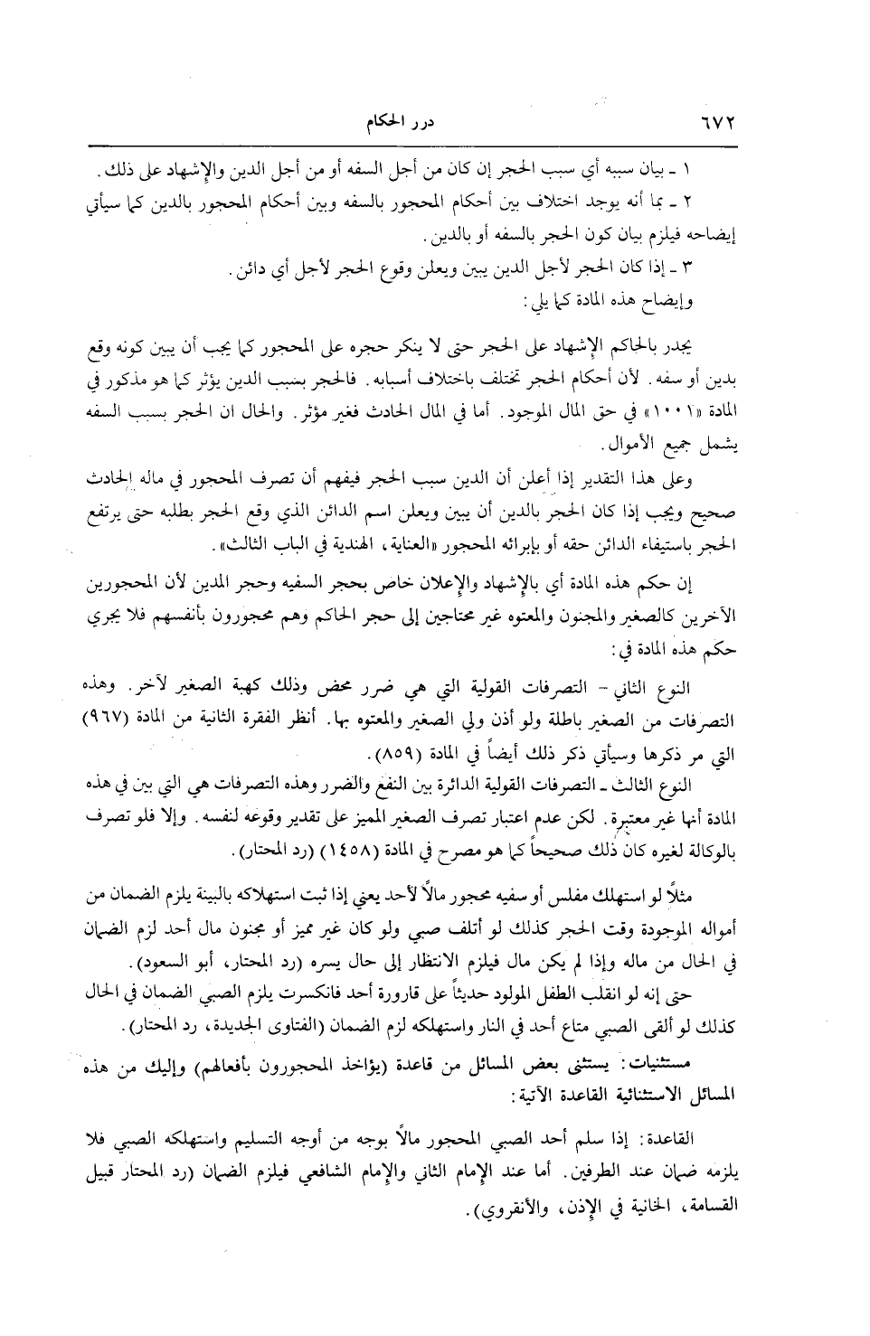 إنَّ حُكْمَ هَذِهِ الْمَادَّةِ أَيْ: بِالْإِشْهَادِ وَالْإِعْلَانِ خَاصٌّ بِحَجْرِ السَّفِيهِ وَحَجْرِ الْمَدِينِ؛ لِأَنَّ الْمَحْجُورِينَ الْآخَرِينَ كَالصَّغِيرِ وَالْمَجْنُونِ وَالْمَعْتُوهِ غَيْرُ مُحْتَاجِينَ إلَى حَجْرِ الْحَاكِمِ وَهُمْ مَحْجُورُونَ بِأَنْفُسِهِمْ فَلَا يَجْرِي حُكْمُ هَذِهِ الْمَادَّةِ فِي: النَّوْعِ الثَّانِي - التَّصَرُّفَاتُ الْقَوْلِيَّةُ الَّتِي هِيَ ضَرَرٌ مَحْضٌ وَذَلِكَ كَهِبَةِ الصَّغِيرِ لِآخَرَ.