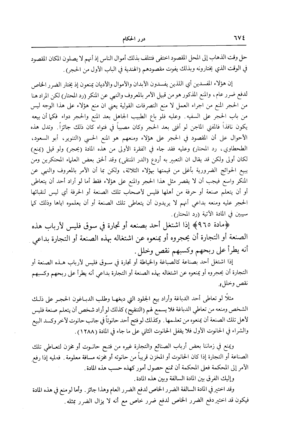 وَتَدُلُّ هَذِهِ الْأَحْوَالُ عَلَى أَنَّ الْمَقْصُودَ فِي الْحَجْرِ عَلَى هَؤُلَاءِ وَمَنْعِهِمْ هُوَ الْمَنْعُ الْحِسِّيُّ (التَّنْوِيرُ، أَبُو السُّعُودِ، الطَّحْطَاوِيُّ، رَدُّ الْمُحْتَارِ) وَعَلَيْهِ فَقَدْ جَاءَ فِي الْفِقْرَةِ الْأُولَى مِنْ هَذِهِ الْمَادَّةِ (يُحْجَرُ) وَلَوْ قِيلَ (يُمْنَعُ) لَكَانَ أَوْلَى وَلَكِنْ قَدْ يُقَالُ: إنَّ التَّعْبِيرَ بِهِ أَرْدَعُ (الدُّرُّ الْمُنْتَقَى) وَقَدْ أَلْحَقَ بَعْضُ الْعُلَمَاءِ الْمُحْتَكِرِينَ وَمَنْ يَبِيعُ الْحَوَائِجَ الضَّرُورِيَّةَ بِأَغْلَى مِنْ قِيمَتِهَا بِهَؤُلَاءِ الثَّلَاثَةِ، وَلَكِنْ بِمَا أَنَّ الْأَمْرَ بِالْمَعْرُوفِ وَالنَّهْيَ عَنْ الْمُنْكَرِ وَاسِعٌ فَيَجِبُ أَنْ لَا يُقْصَرَ مِثْلُ هَذَا الْحَجْرِ وَالْمَنْعِ عَلَى هَؤُلَاءِ فَقَطْ أَمَّا لَوْ أَرَادَ أَحَدٌ أَنْ يَتَعَاطَى أَوْ أَنْ يَتَعَلَّمَ صَنْعَةً أَوْ حِرْفَةً مِنْ أَهْلِهَا؛ فَلَيْسَ لِأَصْحَابِ تِلْكَ الصَّنْعَةِ أَوْ الْحِرْفَةِ أَيْ: لَيْسَ لِنُقَبَائِهَا الْحَجْرُ عَلَيْهِ وَمَنْعُهُ بِدَاعِي أَنَّهُمْ لَا يُرِيدُونَ أَنْ يَتَعَاطَى تِلْكَ الصَّنْعَةَ أَوْ أَنْ يُعَلِّمُوهُ إيَّاهَا وَذَلِكَ كَمَا سَيُبَيَّنُ فِي الْمَادَّةِ الْآتِيَةِ (رَدُّ الْمُحْتَارِ)