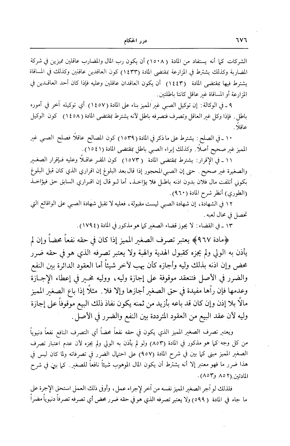 الشَّرِكَاتِ كَمَا أَنَّهُ يُسْتَفَادُ مِنْ الْمَادَّةِ (1508) أَنْ يَكُونَ رَبُّ الْمَالِ وَالْمُضَارِبُ عَاقِلَيْنِ مُمَيِّزَيْنِ فِي شَرِكَةِ الْمُضَارَبَةِ وَكَذَلِكَ يُشْتَرَطُ فِي الْمُزَارَعَةِ بِمُقْتَضَى الْمَادَّةِ (1433) كَوْنُ الْعَاقِدَيْنِ عَاقِلَيْنِ وَكَذَلِكَ فِي الْمُسَاقَاةِ يُشْتَرَطُ فِيهَا بِمُقْتَضَى الْمَادَّةِ (1443) أَنْ يَكُونَ الْعَاقِدَانِ عَاقِلَيْنِ وَعَلَيْهِ فَإِذَا كَانَ أَحَدُ الْعَاقِدَيْنِ فِي الْمُزَارَعَةِ أَوْ الْمُسَاقَاةِ غَيْرَ عَاقِلٍ كَانَتَا بَاطِلَتَيْنِ.