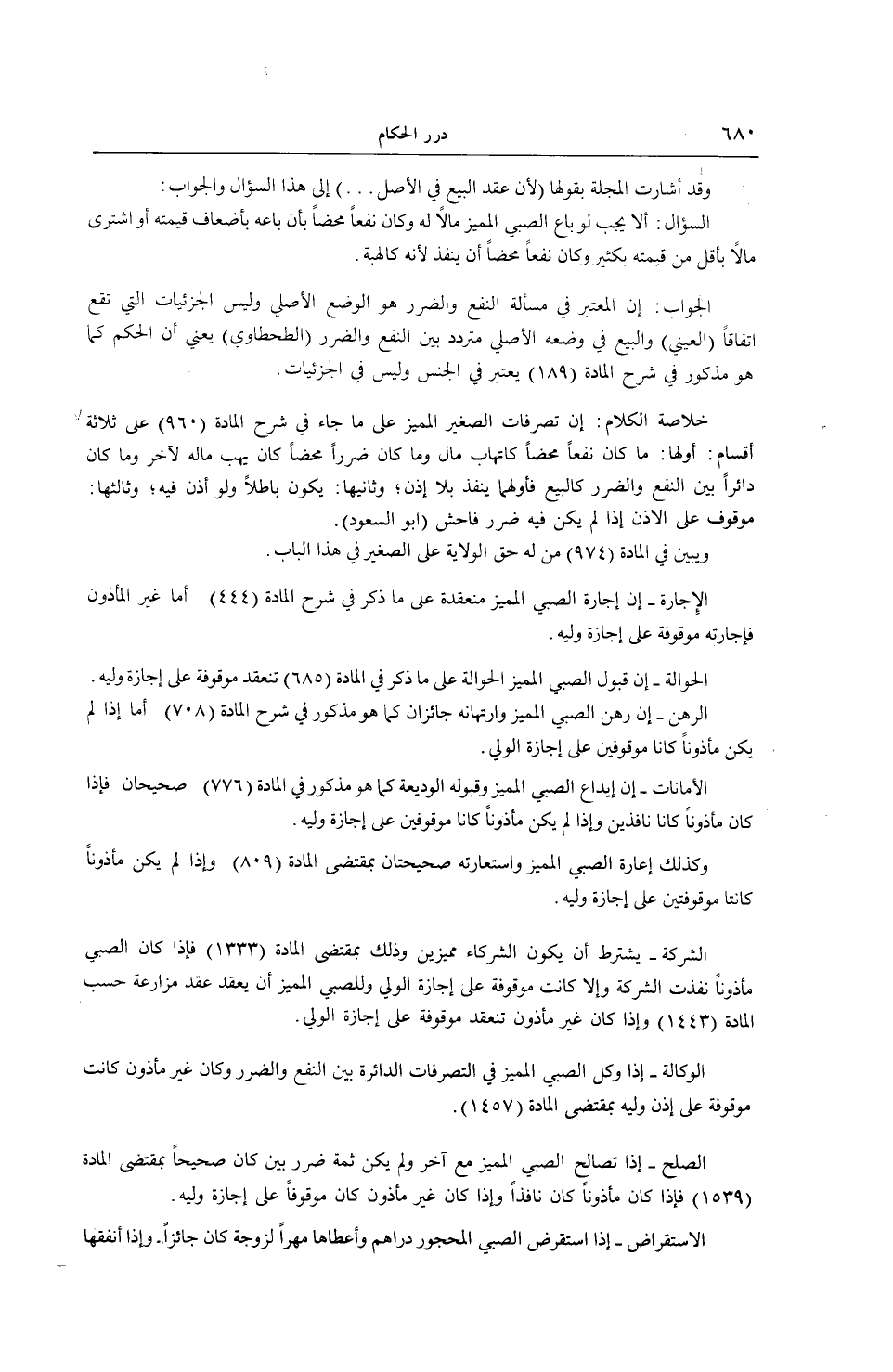 الْجَوَابُ: إنَّ الْمُعْتَبَرَ فِي مَسْأَلَةِ النَّفْعِ وَالضَّرَرِ هُوَ الْوَضْعُ الْأَصْلِيُّ وَلَيْسَ الْجُزْئِيَّاتُ الَّتِي تَقَعُ اتِّفَاقًا (الْعَيْنِيُّ) وَالْبَيْعُ فِي وَضْعِهِ الْأَصْلِيِّ مُتَرَدِّدٌ بَيْنَ النَّفْعِ وَالضَّرَرِ (الطَّحْطَاوِيُّ) يَعْنِي: أَنَّ الْحُكْمَ كَمَا هُوَ مَذْكُورٌ فِي شَرْحِ الْمَادَّةِ (189) يُعْتَبَرُ فِي الْجِنْسِ وَلَيْسَ فِي الْجُزْئِيَّاتِ خُلَاصَةُ الْكَلَامِ: أَنَّ تَصَرُّفَاتِ الصَّغِيرِ الْمُمَيِّزِ عَلَى مَا جَاءَ فِي شَرْحِ الْمَادَّةِ (960) عَلَى ثَلَاثَةِ أَقْسَامٍ: