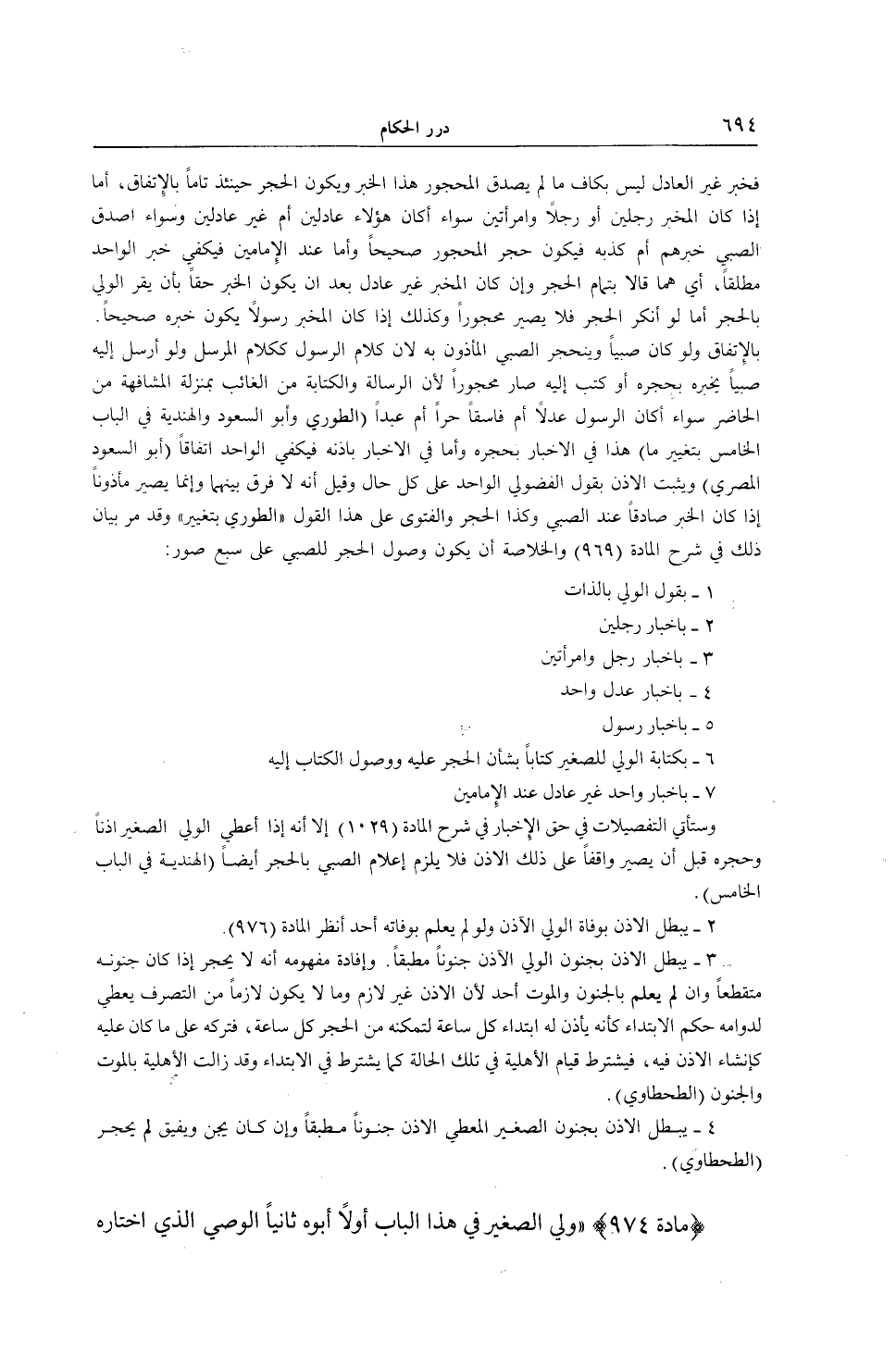[ (مَادَّةُ 974) وَلِيُّ الصَّغِيرِ فِي هَذَا الْبَابِ الْحَجَر]