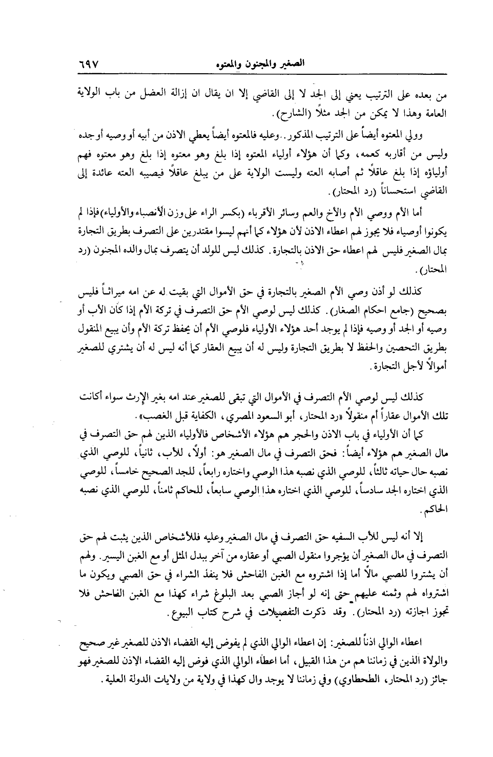 وَعَلَيْهِ فَالْمَعْتُوهُ أَيْضًا يُعْطِي الْإِذْنَ مِنْ أَبِيهِ أَوْ وَصِيِّهِ أَوْ جَدِّهِ وَلَيْسَ مِنْ أَقَارِبِهِ كَعَمِّهِ، وَكَمَا أَنَّ هَؤُلَاءِ أَوْلِيَاءُ الْمَعْتُوهِ إذَا بَلَغَ وَهُوَ مَعْتُوهٌ؛ فَهُمْ أَوْلِيَاؤُهُ إذَا بَلَغَ عَاقِلًا ثُمَّ أَصَابَهُ الْعَتَهُ وَلَيْسَتْ الْوِلَايَةُ عَلَى مَنْ يَبْلُغُ عَاقِلًا فَيُصِيبُهُ الْعَتَهُ عَائِدَةٌ إلَى الْقَاضِي اسْتِحْسَانًا (رَدُّ الْمُحْتَارِ) أَمَّا الْأُمُّ وَوَصِيُّ الْأُمِّ وَالْأَخُ وَالْعَمُّ وَسَائِرُ الْأَقْرِبَاءِ (بِكَسْرِ الرَّاءِ عَلَى وَزْنِ الْأَنْصِبَاءِ وَالْأَوْلِيَاءِ) فَإِذَا لَمْ يَكُونُوا أَوْصِيَاءَ فَلَا يَجُوزُ لَهُمْ إعْطَاءُ الْإِذْنِ؛ لِأَنَّ هَؤُلَاءِ كَمَا أَنَّهُمْ لَيْسُوا مُقْتَدِرِينَ عَلَى التَّصَرُّفِ بِطَرِيقِ التِّجَارَةِ بِمَالِ الصَّغِيرِ؛ فَلَيْسَ لَهُمْ إعْطَاءُ حَقِّ الْإِذْنِ بِالتِّجَارَةِ.