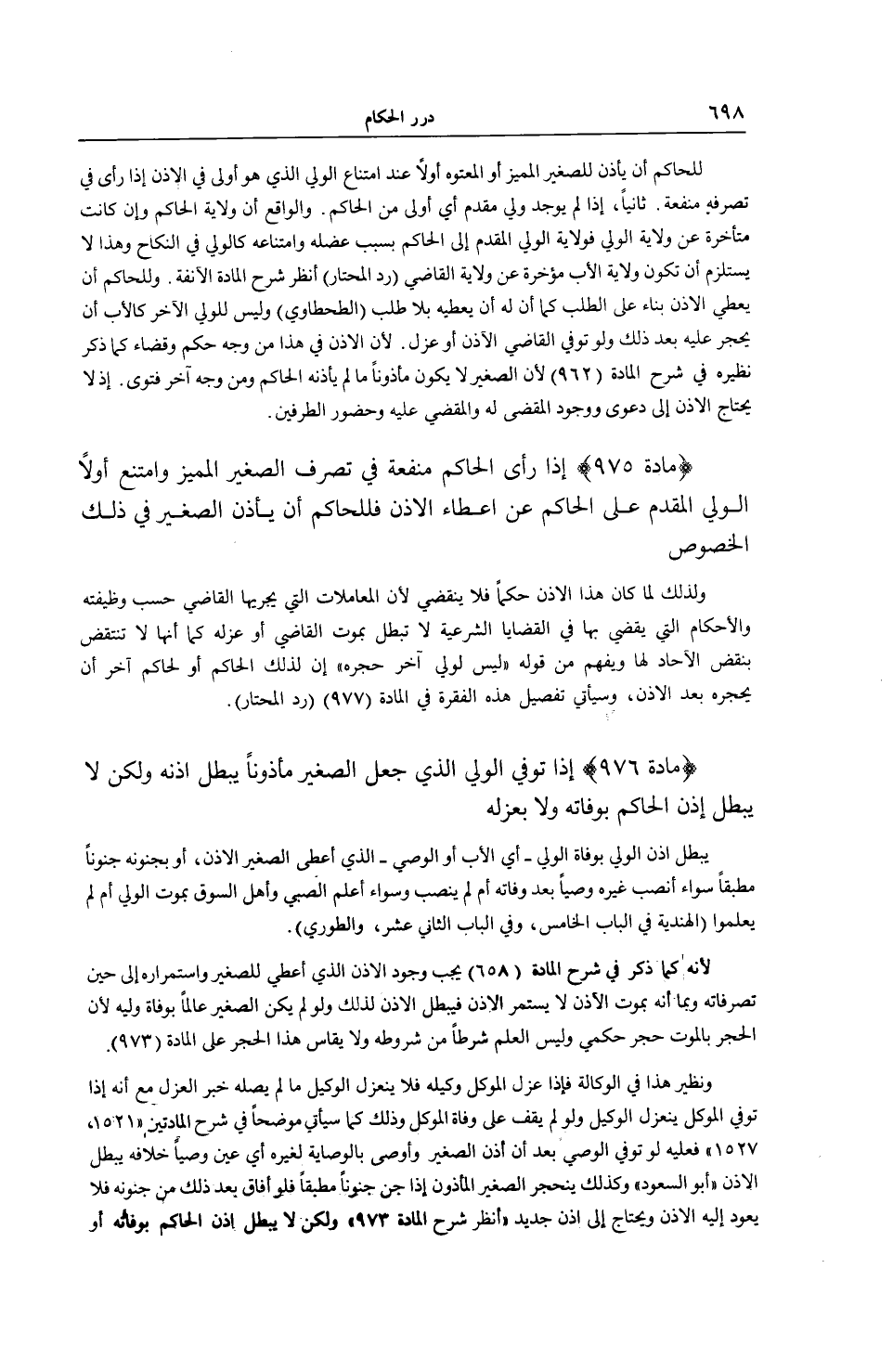 (مَادَّةُ 975) إذَا رَأَى الْحَاكِمُ مَنْفَعَةً فِي تَصَرُّفِ الصَّغِيرِ الْمُمَيِّزِ وَامْتَنَعَ أَوَّلًا الْوَلِيُّ الْمُقَدَّمُ عَلَى الْحَاكِمِ عَنْ إعْطَاءِ الْإِذْنِ فَلِلْحَاكِمِ أَنْ يَأْذَنَ الصَّغِيرَ فِي ذَلِكَ الْخُصُوصِ وَلِذَلِكَ لَمَّا كَانَ هَذَا الْإِذْنُ حُكْمًا فَلَا يَنْقَضِي؛ لِأَنَّ الْمُعَامَلَاتِ الَّتِي يُجْرِيهَا الْقَاضِي حَسَبَ وَظِيفَتِهِ وَالْأَحْكَامُ الَّتِي يَقْضِي بِهَا فِي الْقَضَايَا الشَّرْعِيَّةِ لَا تَبْطُلُ بِمَوْتِ الْقَاضِي أَوْ عَزْلِهِ كَمَا أَنَّهَا لَا تُنْتَقَضُ بِنَقْضِ الْآحَادِ لَهَا وَيُفْهَمُ مِنْ قَوْلِهِ (لَيْسَ لِوَلِيٍّ آخَرَ حَجْرُهُ) أَنَّ لِذَلِكَ الْحَاكِمِ أَوْ لِحَاكِمٍ آخَرَ أَنْ يَحْجُرَهُ بَعْدَ الْإِذْنِ، وَسَيَأْتِي تَفْصِيلُ هَذِهِ الْفِقْرَةِ فِي الْمَادَّةِ (977) (رَدُّ الْمُحْتَارِ) .