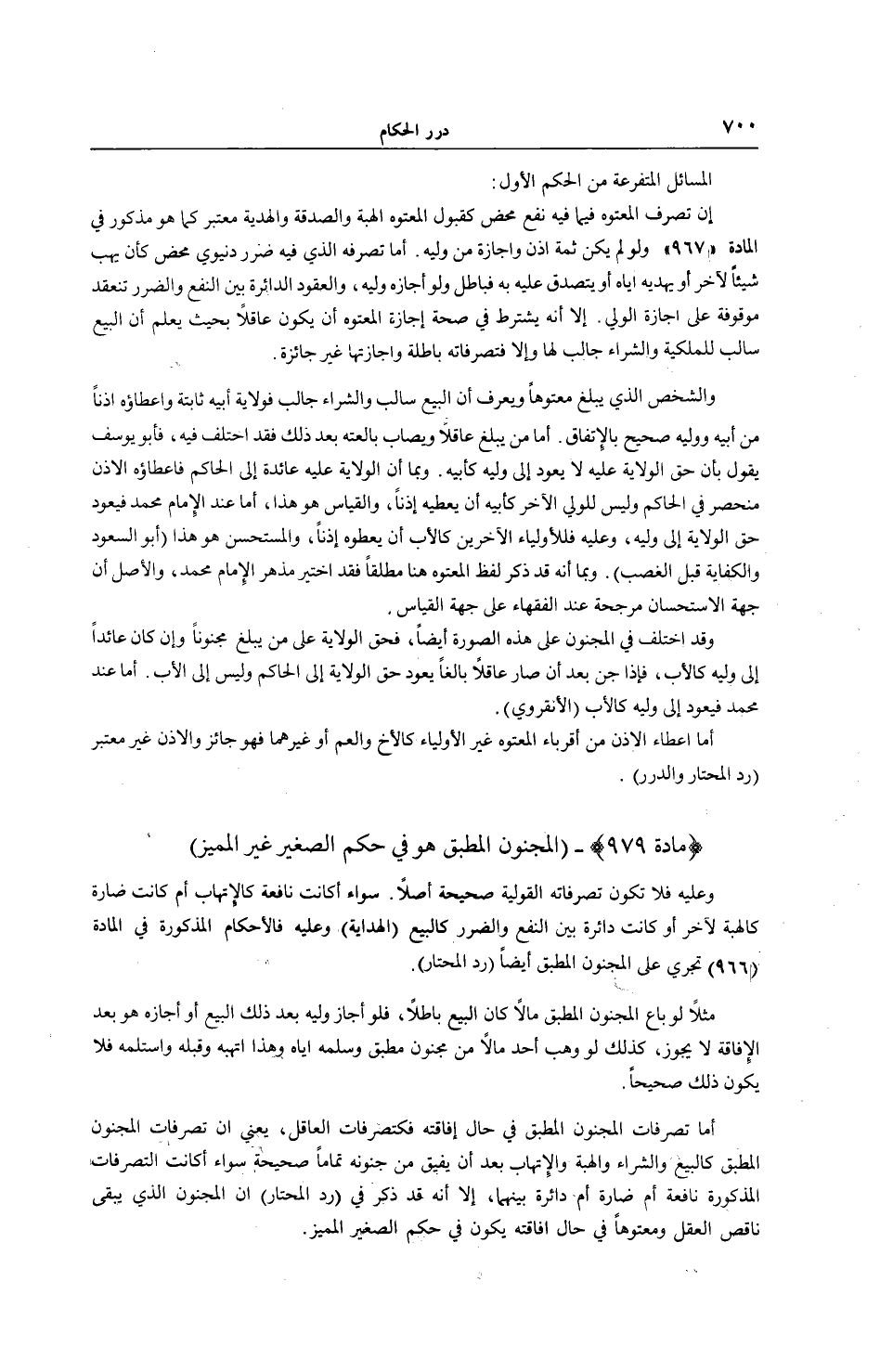 أَنَّ تَصَرُّفَ الْمَعْتُوهِ فِيمَا فِيهِ نَفْعٌ مَحْضٌ كَقَبُولِ الْمَعْتُوهِ الْهِبَةَ وَالصَّدَقَةَ وَالْهَدِيَّةَ مُعْتَبَرٌ كَمَا هُوَ مَذْكُورٌ فِي الْمَادَّةِ (967) وَلَوْ لَمْ يَكُنْ ثَمَّةَ إذْنٌ وَإِجَازَةٌ مِنْ وَلِيِّهِ. أَمَّا تَصَرُّفُهُ الَّذِي فِيهِ ضَرَرٌ دُنْيَوِيٌّ مَحْضٌ كَأَنْ يَهَبَ شَيْئًا لِآخَرَ أَوْ يُهْدِيَهُ إيَّاهُ أَوْ يَتَصَدَّقَ عَلَيْهِ بِهِ فَبَاطِلٌ وَلَوْ أَجَازَهُ وَلِيُّهُ، وَالْعُقُودُ الدَّائِرَةُ بَيْنَ النَّفْعِ وَالضَّرَرِ تَنْعَقِدُ مَوْقُوفَةً عَلَى إجَازَةِ الْوَلِيِّ إلَّا أَنَّهُ يُشْتَرَطُ فِي صِحَّةِ إجَازَةِ الْمَعْتُوهِ أَنْ يَكُونَ عَاقِلًا بِحَيْثُ يَعْلَمُ أَنَّ الْبَيْعَ سَالِبٌ لِلْمِلْكِيَّةِ وَالشِّرَاءَ جَالِبٌ لَهَا وَإِلَّا فَتَصَرُّفَاتُهُ بَاطِلَةٌ وَإِجَازَتُهَا غَيْرُ جَائِزَةٍ وَالشَّخْصُ الَّذِي يَبْلُغُ مَعْتُوهًا وَيَعْرِفُ أَنَّ الْبَيْعَ سَالِبٌ وَالشِّرَاءَ جَالِبٌ فَوِلَايَةُ أَبِيهِ ثَابِتَةٌ وَإِعْطَاؤُهُ إذْنًا مِنْ أَبِيهِ وَوَلِيِّهِ صَحِيحٌ بِالِاتِّفَاقِ. أَمَّا مَنْ يَبْلُغُ عَاقِلًا وَيُصَابُ بِالْعَتَهِ بَعْدَ ذَلِكَ فَقَدْ اُخْتُلِفَ فِيهِ، فَأَبُو يُوسُفَ يَقُولُ بِأَنَّ حَقَّ الْوِلَايَةِ عَلَيْهِ لَا يَعُودُ إلَى وَلِيِّهِ كَأَبِيهِ. وَبِمَا أَنَّ الْوِلَايَةَ عَلَيْهِ عَائِدَةٌ إلَى الْحَاكِمِ فَإِعْطَاؤُهُ الْإِذْنَ فِي الْحَاكِمِ وَلَيْسَ لِلْوَلِيِّ الْآخَرِ كَأَبِيهِ أَنْ يُعْطِيَهُ إذْنًا، وَالْقِيَاسُ هُوَ هَذَا، أَمَّا عِنْدَ الْإِمَامِ مُحَمَّدٍ فَيَعُودُ حَقُّ الْوِلَايَةِ إلَى وَلِيِّهِ، وَعَلَيْهِ فَلِلْأَوْلِيَاءِ الْآخَرِينَ - كَالْأَبِ - أَنْ يُعْطُوهُ إذْنًا، وَالْمُسْتَحْسَنُ هُوَ هَذَا (أَبُو السُّعُودِ الْكِفَايَةُ قَبْلَ الْغَصْبِ) . وَبِمَا أَنَّهُ قَدْ ذَكَرَ لَفْظَ الْمَعْتُوهِ هُنَا مُطْلَقًا فَقَدْ اُخْتِيرَ مَذْهَبُ الْإِمَامِ مُحَمَّدٍ، وَالْأَصْلُ أَنَّ جِهَةَ الِاسْتِحْسَانِ مُرَجَّحَةٌ عِنْدَ الْفُقَهَاءِ عَلَى جِهَةِ الْقِيَاسِ. وَقَدْ اُخْتُلِفَ فِي الْمَجْنُونِ عَلَى هَذِهِ الصُّورَةِ أَيْضًا، فَحَقُّ الْوِلَايَةِ عَلَى مَنْ يَبْلُغُ مَجْنُونًا وَإِنْ كَانَ عَائِدًا إلَى وَلِيِّهِ كَالْأَبِ، فَإِذَا جُنَّ بَعْدَ أَنْ صَارَ عَاقِلًا بَالِغًا يَعُودُ حَقُّ الْوِلَايَةِ إلَى الْحَاكِمِ وَلَيْسَ إلَى الْأَبِ. أَمَّا عِنْدَ مُحَمَّدٍ فَيَعُودُ إلَى وَلِيِّهِ كَالْأَبِ (الْأَنْقِرْوِيُّ) . أَمَّا إعْطَاءُ الْإِذْنِ مِنْ أَقْرِبَاءِ الْمَعْتُوهِ غَيْرِ الْأَوْلِيَاءِ كَالْأَخِ وَالْعَمِّ أَوْ غَيْرِهِمَا فَهُوَ جَائِزٌ وَالْإِذْنُ غَيْرُ مُعْتَبَرٍ (رَدُّ الْمُحْتَارِ وَالدُّرَرُ) .