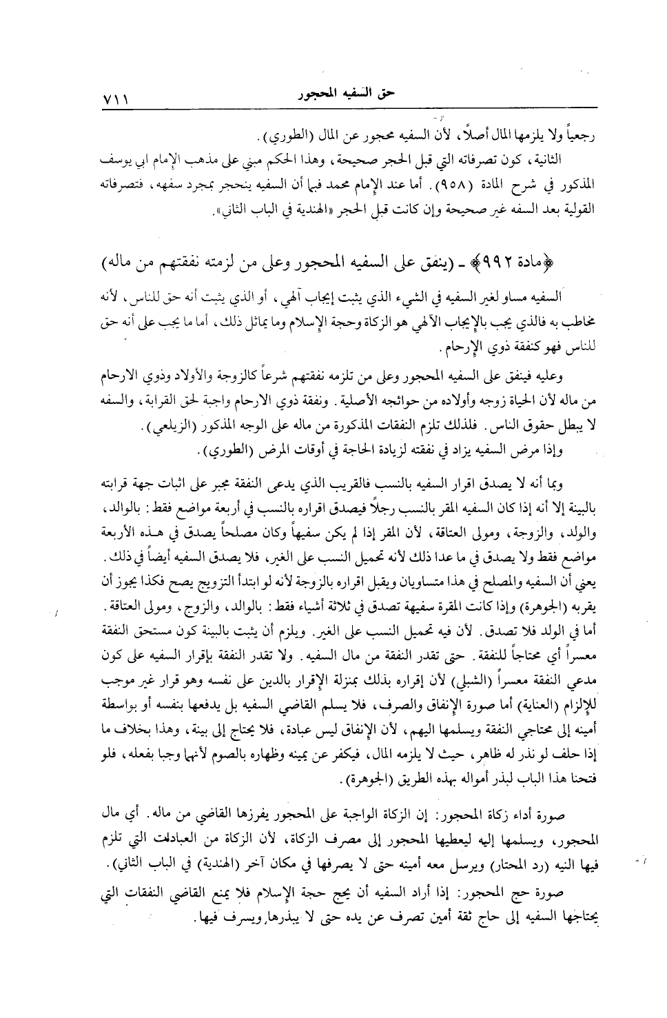 [ (مَادَّةُ 992) يُنْفَقُ عَلَى السَّفِيهِ الْمَحْجُورِ وَعَلَى مَنْ لَزِمَتْهُ نَفَقَتُهُمْ مِنْ مَالِهِ]