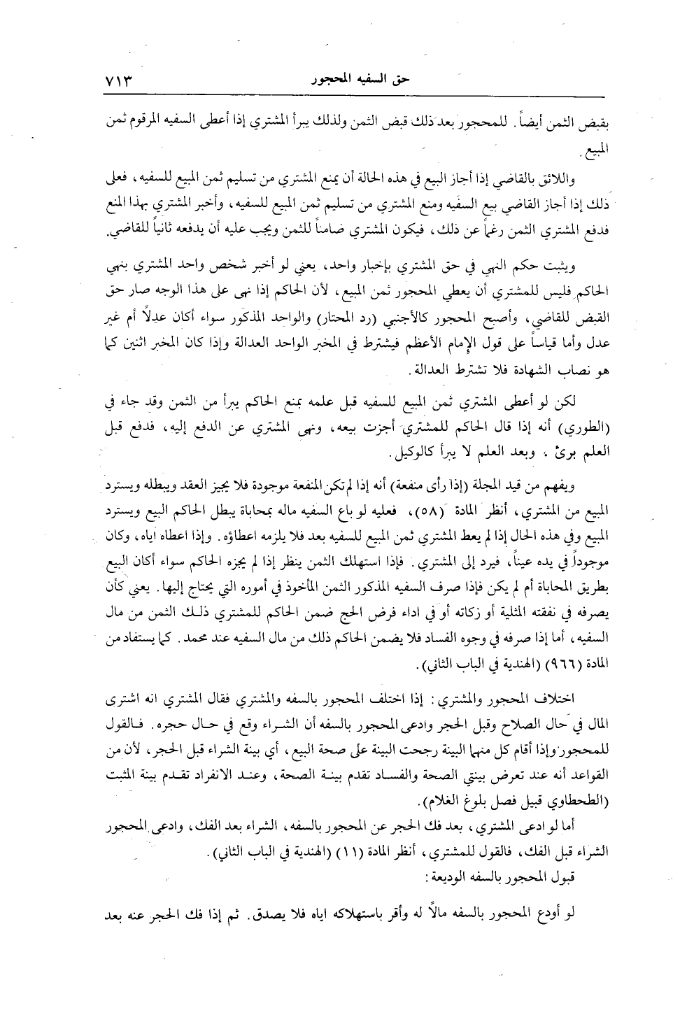 بِقَبْضِ الثَّمَنِ أَيْضًا. لِلْمَحْجُورِ بَعْدَ ذَلِكَ قَبْضُ الثَّمَنِ وَلِذَلِكَ يَبْرَأُ الْمُشْتَرِي إذَا أَعْطَى السَّفِيهَ الْمَرْقُومَ ثَمَنَ الْمَبِيعِ، وَاللَّائِقُ بِالْقَاضِي إذَا أَجَازَ الْبَيْعَ فِي هَذِهِ الْحَالَةِ أَنْ يَمْنَعَ الْمُشْتَرِيَ مِنْ تَسْلِيمِ ثَمَنِ الْمَبِيعِ لِلسَّفِيهِ، فَعَلَى ذَلِكَ إذَا أَجَازَ الْقَاضِي بَيْعَ السَّفِيهِ وَمَنَعَ الْمُشْتَرِيَ مِنْ تَسْلِيمِ ثَمَنِ الْمَبِيعِ لِلسَّفِيهِ، وَأَخْبَرَ الْمُشْتَرِيَ بِهَذَا الْمَنْعِ فَدَفَعَ الْمُشْتَرِي الثَّمَنَ رَغْمًا عَنْ ذَلِكَ، فَيَكُونُ الْمُشْتَرِي ضَامِنًا لِلثَّمَنِ وَيَجِبُ عَلَيْهِ أَنْ يَدْفَعَهُ ثَانِيًا لِلْقَاضِي، وَيَثْبُتُ حُكْمُ النَّهْيِ فِي حَقِّ الْمُشْتَرِي بِإِخْبَارِ وَاحِدٍ، يَعْنِي لَوْ أَخْبَرَ شَخْصٌ وَاحِدٌ الْمُشْتَرِيَ بِنَهْيِ الْحَاكِمِ فَلَيْسَ لِلْمُشْتَرِي أَنْ يُعْطِيَ الْمَحْجُورَ ثَمَنَ الْمَبِيعِ؛ لِأَنَّ الْحَاكِمَ إذَا نَهَى عَلَى هَذَا الْوَجْهِ صَارَ حَقُّ الْقَبْضِ لِلْقَاضِي، وَأَصْبَحَ الْمَحْجُورُ كَالْأَجْنَبِيِّ (رَدُّ الْمُحْتَارِ) وَالْوَاحِدُ الْمَذْكُورُ سَوَاءٌ أَكَانَ عَدْلًا أَمْ غَيْرَ عَدْلٍ، وَأَمَّا قِيَاسًا عَلَى قَوْلِ الْإِمَامِ الْأَعْظَمِ فَيُشْتَرَطُ فِي الْخَبَرِ الْوَاحِدِ الْعَدَالَةُ وَإِذَا كَانَ الْمُخْبِرُ اثْنَيْنِ كَمَا هُوَ نِصَابُ الشَّهَادَةِ فَلَا تُشْتَرَطُ الْعَدَالَةُ لَكِنْ لَوْ أَعْطَى الْمُشْتَرِي ثَمَنَ الْمَبِيعِ لِلسَّفِيهِ قَبْلَ عِلْمِهِ بِمَنْعِ الْحَاكِمِ يَبْرَأُ مِنْ الثَّمَنِ وَقَدْ جَاءَ فِي (الطُّورِيِّ) أَنَّهُ إذْ قَالَ الْحَاكِمُ لِلْمُشْتَرِي أَجَزْتُ بَيْعَهُ، وَنَهَى الْمُشْتَرِيَ عَنْ الدَّفْعِ إلَيْهِ، فَدَفَعَ قَبْلَ الْعِلْمِ بَرِئَ، وَبَعْدَ الْعِلْمِ لَا يَبْرَأُ كَالْوَكِيلِ.