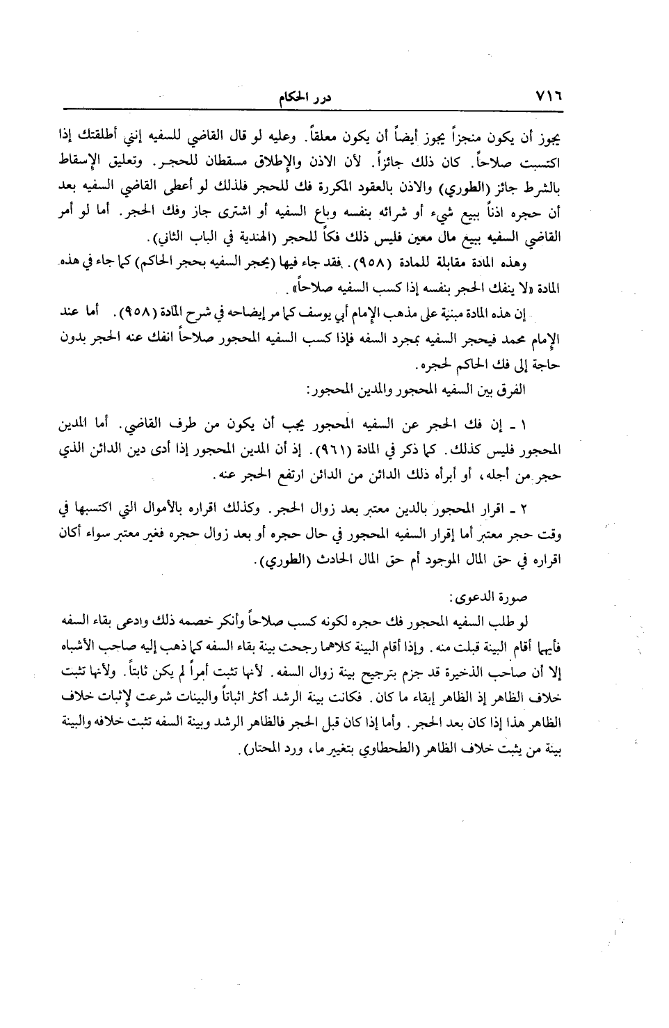 1 - إنَّ فَكَّ الْحَجْرِ عَنْ السَّفِيهِ الْمَحْجُورِ يَجِبُ أَنْ يَكُونَ مِنْ طَرَفِ الْقَاضِي. أَمَّا الْمَدِينُ الْمَحْجُورُ فَلَيْسَ كَذَلِكَ. كَمَا ذُكِرَ فِي الْمَادَّةِ (961) . إذْ أَنَّ الْمَدِينَ الْمَحْجُورَ إذَا أَدَّى دَيْنَ الدَّائِنِ الَّذِي حُجِرَ مِنْ أَجْلِهِ، أَوْ أَبْرَأَهُ ذَلِكَ الدَّائِنُ مِنْ الدَّائِنِ ارْتَفَعَ الْحَجْرُ عَنْهُ.