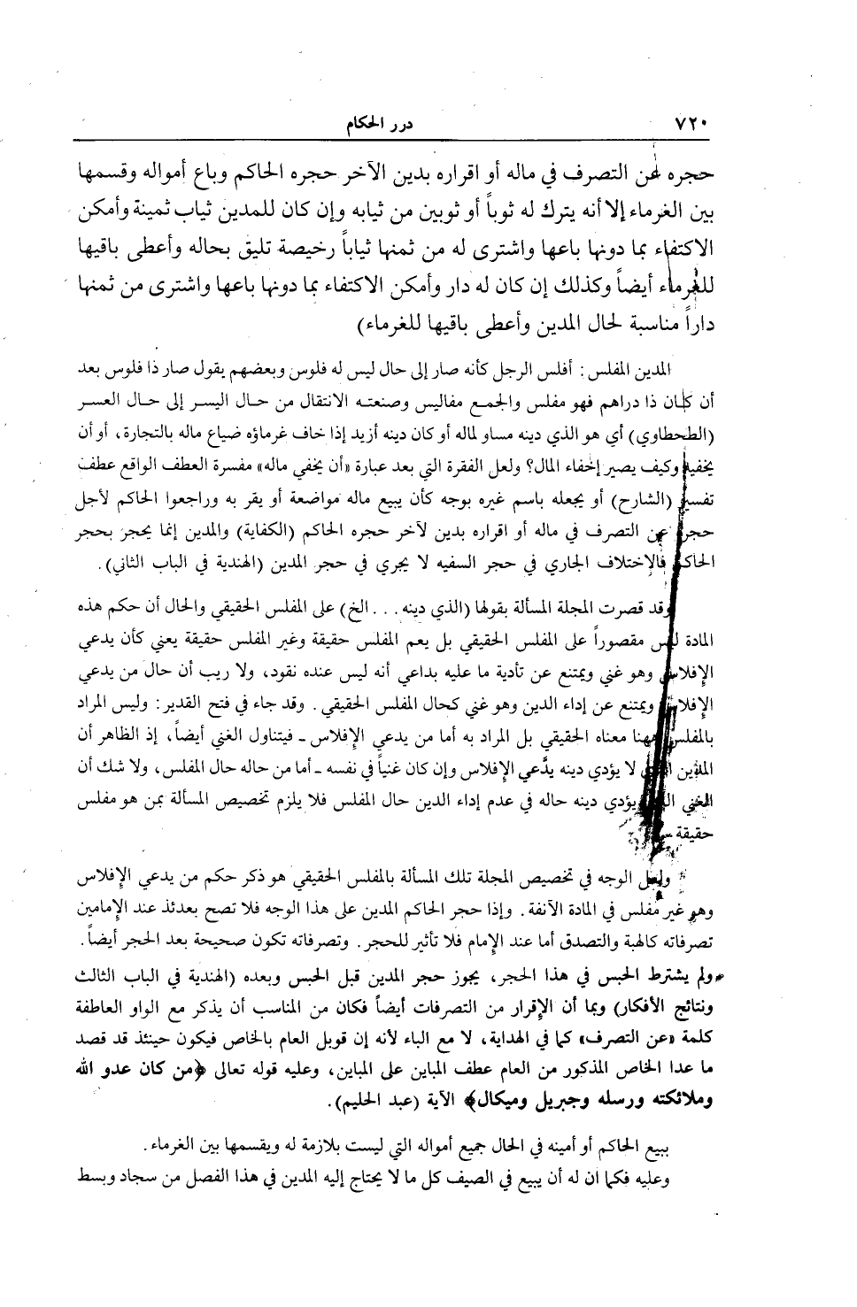 وَالْمَدِينُ إنَّمَا يُحْجَرُ بِحَجْرِ الْحَاكِمِ فَالِاخْتِلَافُ الْجَارِي فِي حَجْرِ السَّفِيهِ لَا يَجْرِي فِي حَجْرِ الْمَدِينِ (الْهِنْدِيَّةُ فِي الْبَابِ الثَّانِي) . وَقَدْ قَصَرَتْ الْمَجَلَّةُ الْمَسْأَلَةَ بِقَوْلِهَا (الَّذِي دَيْنُهُ. إلَخْ) عَلَى الْمُفْلِسِ الْحَقِيقِيِّ، وَالْحَالُ أَنَّ حُكْمَ هَذِهِ الْمَادَّةِ لَيْسَ مَقْصُورًا عَلَى الْمُفْلِسِ الْحَقِيقِيِّ بَلْ يَعُمُّ الْمُفْلِسَ حَقِيقَةً وَغَيْرَ الْمُفْلِسِ حَقِيقَةً يَعْنِي كَأَنْ يَدَّعِيَ الْإِفْلَاسَ وَهُوَ غَنِيٌّ وَمُمْتَنِعٌ عَنْ تَأْدِيَةِ مَا عَلَيْهِ بِدَاعِي أَنَّهُ لَيْسَ عِنْدَهُ نُقُودٌ، وَلَا رَيْبَ أَنَّ حَالَ مَنْ يَدَّعِي الْإِفْلَاسَ وَمُمْتَنِعٌ عَنْ أَدَاءِ الدَّيْنِ وَهُوَ غَنِيٌّ كَحَالِ الْمُفْلِسِ الْحَقِيقِيِّ. وَقَدْ جَاءَ فِي فَتْحِ الْقَدِيرِ: وَلَيْسَ الْمُرَادُ بِالْمُفْلِسِ هَهُنَا مَعْنَاهُ الْحَقِيقِيَّ بَلْ الْمُرَادُ بِهِ إمَّا مَنْ يَدَّعِي الْإِفْلَاسَ - فَيَتَنَاوَلُ الْغَنِيَّ أَيْضًا، إذْ الظَّاهِرُ أَنَّ الْمَدِينَ الَّذِي لَا يُؤَدِّي دَيْنَهُ يَدَّعِي الْإِفْلَاسَ وَإِنْ كَانَ غَنِيًّا فِي نَفْسِهِ - إمَّا مَنْ حَالُهُ حَالُ الْمُفْلِسِ، وَلَا شَكَّ أَنَّ الْغَنِيَّ الَّذِي يُؤَدِّي دَيْنَهُ حَالٌ فِي عَدَمِ أَدَاءِ الدَّيْنِ حَالَ الْمُفْلِسِ فَلَا يَلْزَمُ تَخْصِيصُ الْمَسْأَلَةِ بِمَنْ هُوَ مُفْلِسٌ حَقِيقَةً. وَلَعَلَّ الْوَجْهَ فِي تَخْصِيصِ الْمَجَلَّةِ تِلْكَ الْمَسْأَلَةَ بِالْمُفْلِسِ الْحَقِيقِيِّ هُوَ ذِكْرُ حُكْمِ مَنْ يَدَّعِي الْإِفْلَاسَ وَهُوَ غَيْرُ مُفْلِسٍ فِي الْمَادَّةِ الْآنِفَةِ.