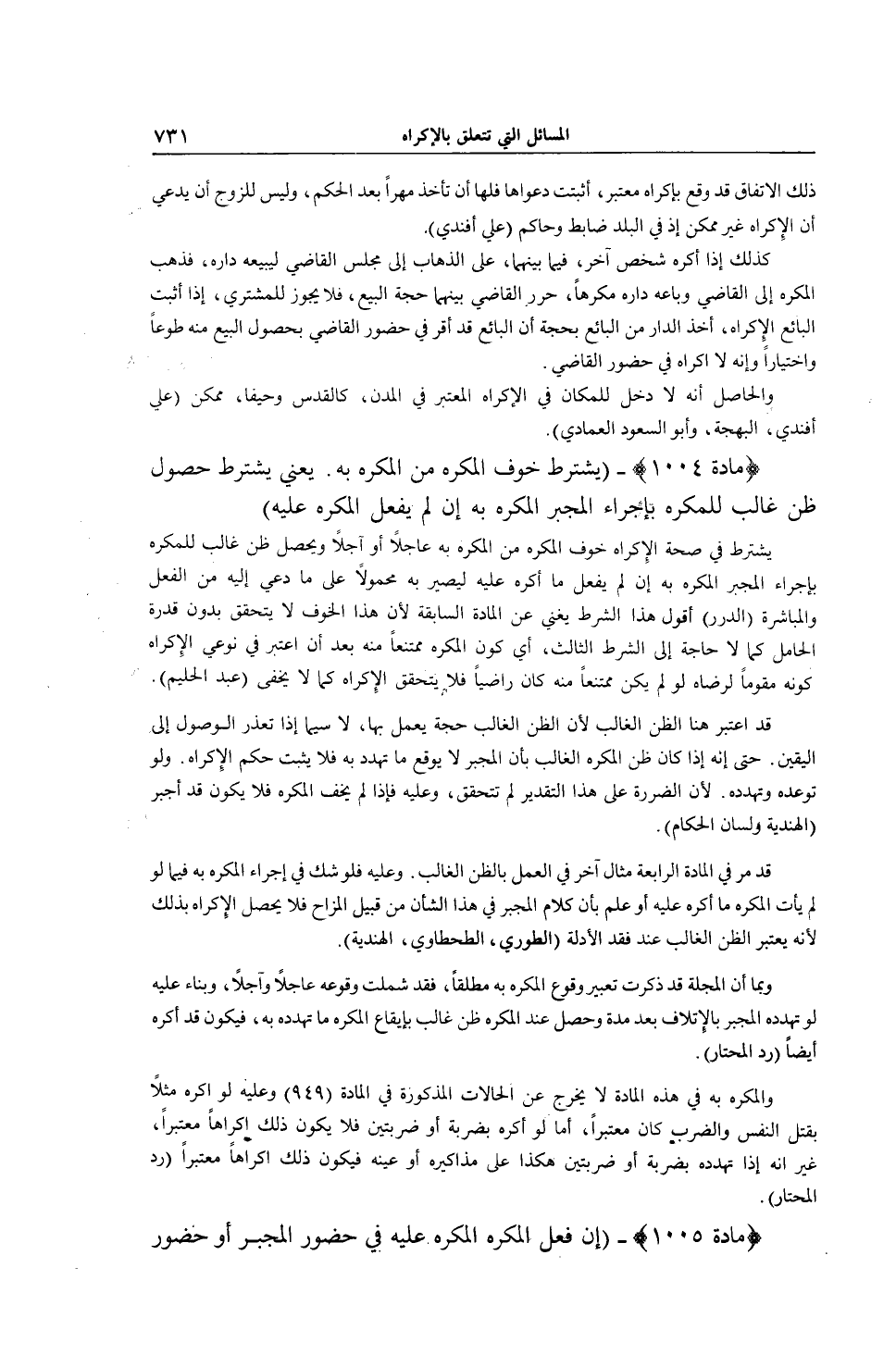 ، (مَادَّةُ 1005) -، (إنَّ فِعْلَ الْمُكْرَهِ الْمُكْرَهِ عَلَيْهِ فِي حُضُورِ الْمُجْبِرِ أَوْ حُضُورِ