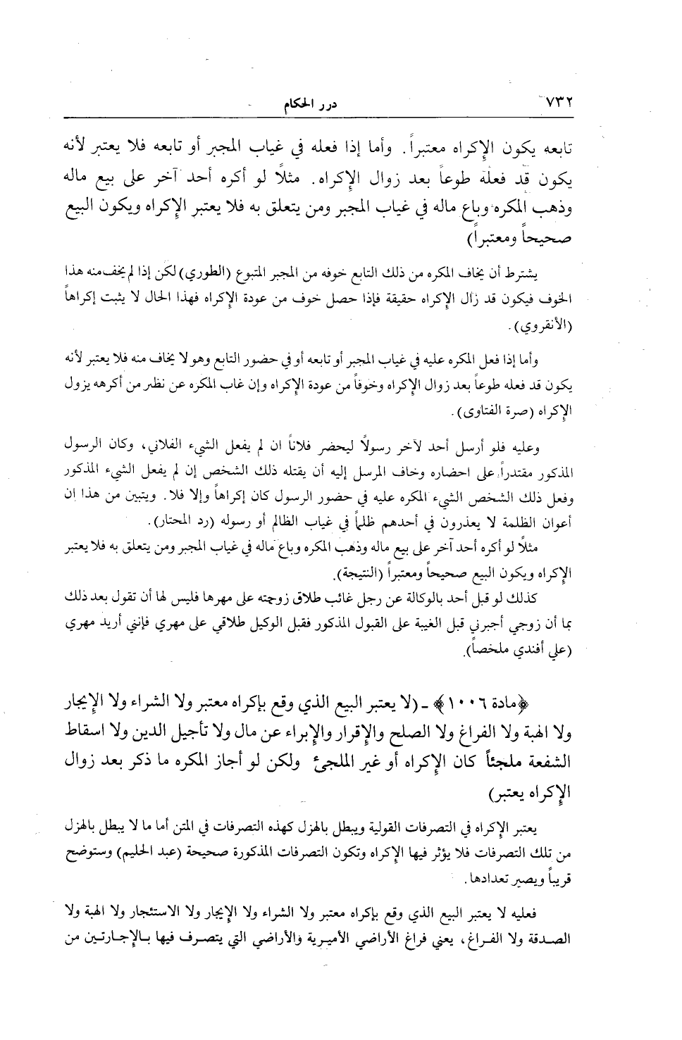 (مَادَّةُ 1006) -، (لَا يُعْتَبَرُ الْبَيْعُ الَّذِي وَقَعَ بِإِكْرَاهٍ مُعْتَبَرٍ وَلَا الشِّرَاءُ وَلَا الْإِيجَارُ وَلَا الْهِبَةُ وَلَا الْفَرَاغُ وَلَا الصُّلْحُ وَالْإِقْرَارُ وَالْإِبْرَاءُ عَنْ مَالٍ وَلَا تَأْجِيلُ الدِّينِ وَلَا إسْقَاطُ الشُّفْعَةِ، مُلْجِئًا كَانَ الْإِكْرَاهُ أَوْ غَيْرُ الْمُلْجِئِ، وَلَكِنْ لَوْ أَجَازَ الْمُكْرَهُ مَا ذَكَرَ بَعْدَ زَوَالِ الْإِكْرَاهِ يُعْتَبَرُ) يُعْتَبَرُ الْإِكْرَاهُ فِي التَّصَرُّفَاتِ الْقَوْلِيَّةِ وَيَبْطُلُ بِالْهَزْلِ كَهَذِهِ التَّصَرُّفَاتِ فِي الْمَتْنِ، أَمَّا مَا لَا يَبْطُلُ بِالْهَزْلِ مِنْ تِلْكَ التَّصَرُّفَاتِ فَلَا يُؤَثِّرُ فِيهَا الْإِكْرَاهُ، وَتَكُونُ التَّصَرُّفَاتُ الْمَذْكُورَةُ صَحِيحَةً، (عَبْدُ الْحَلِيمِ)