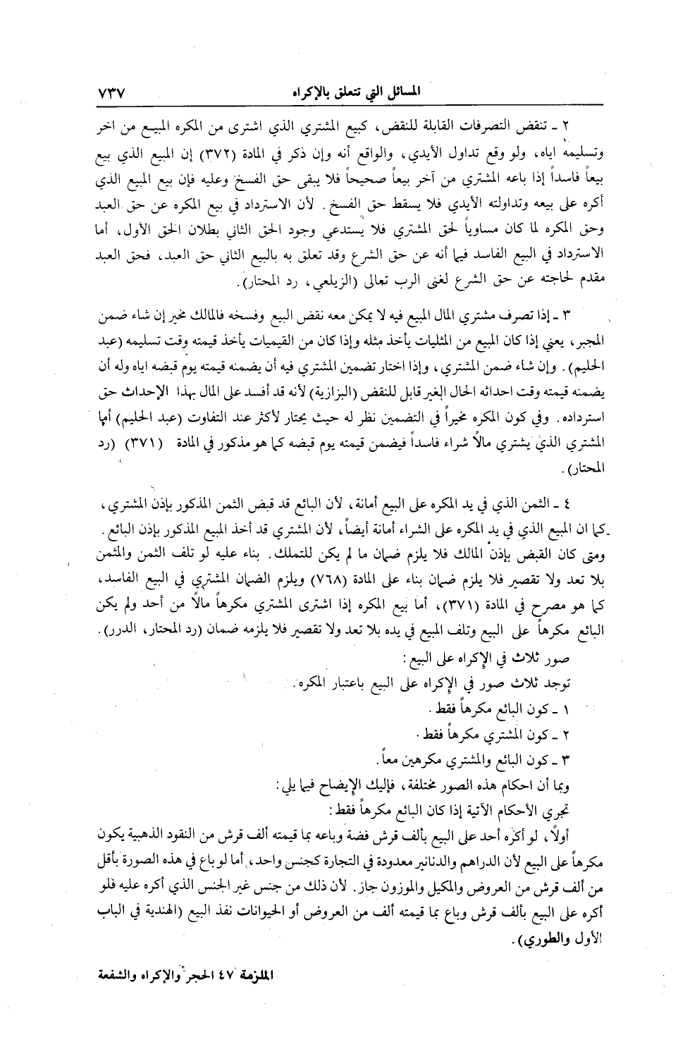 2 - تُنْقَضُ التَّصَرُّفَاتُ الْقَابِلَةُ لِلنَّقْضِ، كَبَيْعِ الْمُشْتَرِي الَّذِي اشْتَرَى مِنْ الْمُكْرَهِ الْمَبِيعَ مِنْ آخَرَ وَتَسْلِيمِهِ إيَّاهُ، وَلَوْ وَقَعَ تَدَاوُلُ الْأَيْدِي، وَالْوَاقِعُ أَنَّهُ وَإِنْ ذُكِرَ فِي الْمَادَّةِ، (372) أَنَّ الْمَبِيعَ الَّذِي بِيعَ بَيْعًا فَاسِدًا إذَا بَاعَهُ الْمُشْتَرِي مِنْ آخَرَ بَيْعًا صَحِيحًا فَلَا يَبْقَى حَقُّ الْفَسْخِ، وَعَلَيْهِ فَإِنَّ بَيْعَ الْمَبِيعِ الَّذِي أُكْرِهَ عَلَى بَيْعِهِ وَتَدَاوَلَتْهُ الْأَيْدِي فَلَا يَسْقُطُ حَقُّ الْفَسْخِ؛ لِأَنَّ الِاسْتِرْدَادَ فِي بَيْعِ الْمُكْرَهِ عَنْ حَقِّ الْعَبْدِ، وَحَقُّ الْمُكْرَهِ لَمَّا كَانَ مُسَاوِيًا لِحَقِّ الْمُشْتَرِي فَلَا يَسْتَدْعِي وُجُودُ الْحَقِّ الثَّانِي بُطْلَانَ الْحَقِّ الْأَوَّلِ، أَمَّا الِاسْتِرْدَادُ فِي الْبَيْعِ الْفَاسِدِ فَبِمَا أَنَّهُ عَنْ حَقِّ الشَّرْعِ وَقَدْ تَعَلَّقَ بِهِ بِالْبَيْعِ الثَّانِي حَقُّ الْعَبْدِ. فَحَقُّ الْعَبْدِ مُقَدَّمٌ لِحَاجَتِهِ عَنْ حَقِّ الشَّرْعِ لِغِنَى الرَّبِّ تَعَالَى، (الزَّيْلَعِيّ، رَدُّ الْمُحْتَارِ) .