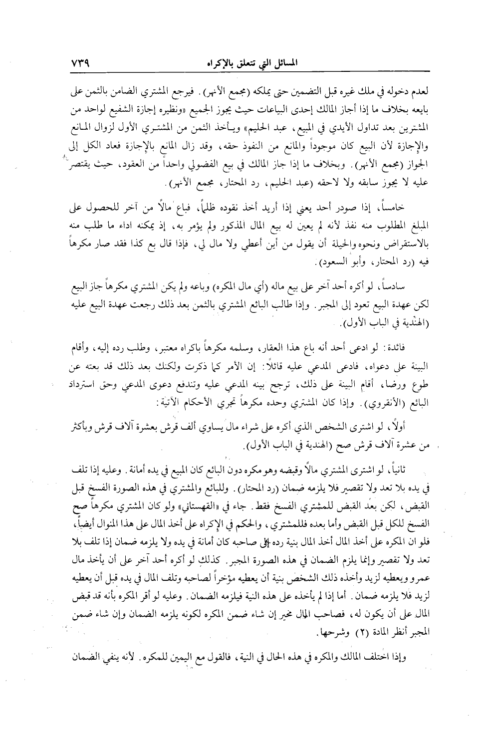 سَادِسًا، لَوْ أَكْرَهَ أَحَدٌ آخَرَ عَلَى بَيْعِ مَالِهِ، (أَيْ مَالِ الْمُكْرَهِ) وَبَاعَهُ وَلَمْ يَكُنْ الْمُشْتَرِي مُكْرَهًا جَازَ الْبَيْعُ لَكِنَّ عُهْدَةَ الْبَيْعِ تَعُودُ إلَى الْمُجْبِرِ. وَإِذَا طَالَبَ الْبَائِعُ الْمُشْتَرِيَ بِالثَّمَنِ بَعْدَ ذَلِكَ رَجَعَتْ عُهْدَةُ الْبَيْعِ عَلَيْهِ، (الْهِنْدِيَّةُ فِي الْبَابِ الْأَوَّلِ) .