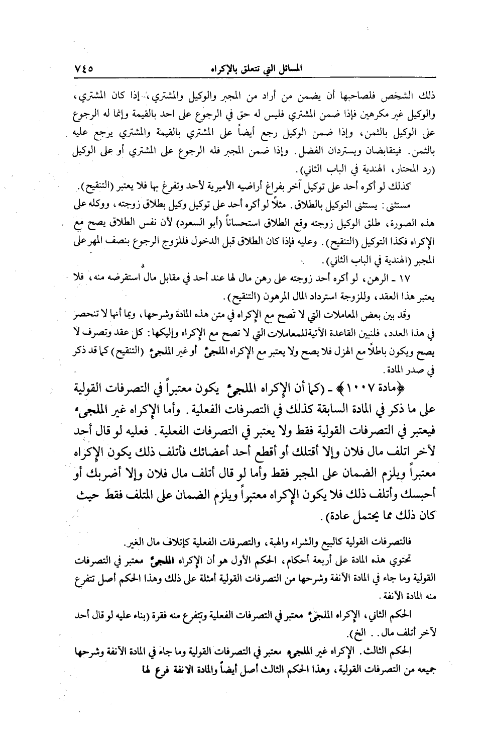 (مَادَّةُ 1007) -، (كَمَا أَنَّ الْإِكْرَاهَ الْمُلْجِئَ يَكُونُ مُعْتَبَرًا فِي التَّصَرُّفَاتِ الْقَوْلِيَّةِ عَلَى مَا ذُكِرَ فِي الْمَادَّةِ السَّابِقَةِ كَذَلِكَ فِي التَّصَرُّفَاتِ الْفِعْلِيَّةِ. وَأَمَّا الْإِكْرَاهُ غَيْرُ الْمُلْجِئِ فَيُعْتَبَرُ فِي التَّصَرُّفَاتِ الْقَوْلِيَّةِ فَقَطْ وَلَا يُعْتَبَرُ فِي التَّصَرُّفَاتِ الْفِعْلِيَّةِ. فَعَلَيْهِ لَوْ قَالَ أَحَدٌ لِآخَرَ اتْلَفْ مَالَ فُلَانٍ وَإِلَّا أَقْتُلْك أَوْ اقْطَعْ أَحَدَ أَعْضَائِك فَأَتْلَفَ ذَلِكَ يَكُونُ الْإِكْرَاهُ مُعْتَبَرًا وَيَلْزَمُ الضَّمَانُ عَلَى الْمُجْبِرِ فَقَطْ، وَأَمَّا لَوْ قَالَ اتْلَفْ مَالَ فُلَانٍ وَإِلَّا أَضْرِبْكَ أَوْ أَحْبِسُك وَأَتْلَفَ ذَلِكَ فَلَا يَكُونُ الْإِكْرَاهُ مُعْتَبَرًا وَيَلْزَمُ الضَّمَانُ عَلَى الْمُتْلِفِ فَقَطْ حَيْثُ كَانَ ذَلِكَ مِمَّا يُحْتَمَلُ عَادَةً) .