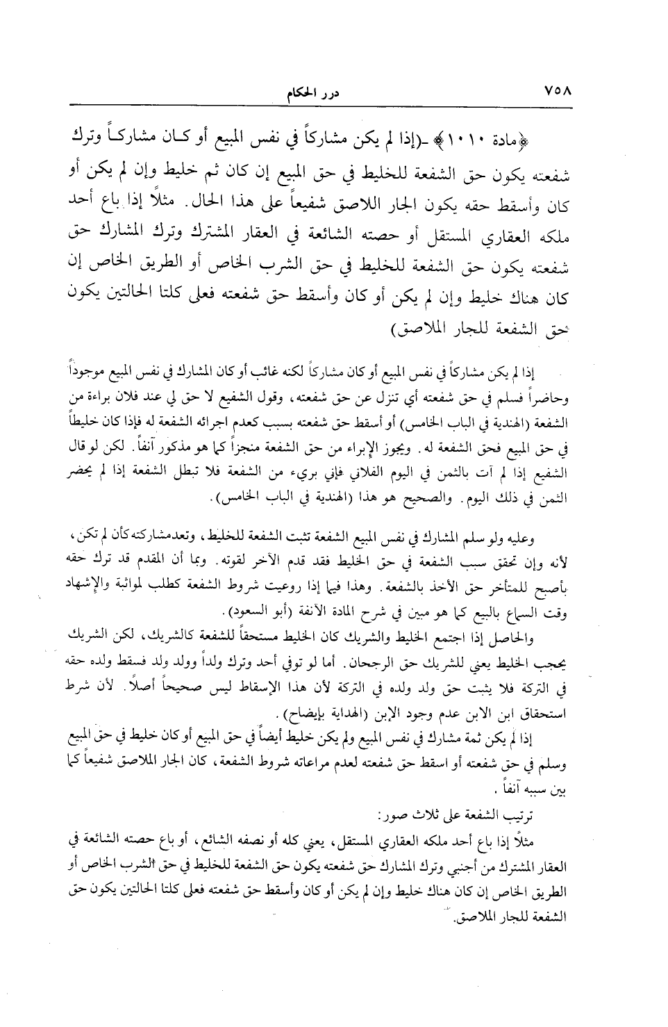 تَرْتِيبُ الشُّفْعَةِ عَلَى ثَلَاثِ صُوَرٍ: مَثَلًا إذَا بَاعَ أَحَدٌ مِلْكَهُ الْعَقَارِيَّ الْمُسْتَقِلَّ، يَعْنِي كُلَّهُ أَوْ نِصْفَهُ الشَّائِعَ أَوْ بَاعَ حِصَّتَهُ الشَّائِعَةَ فِي الْعَقَارِ الْمُشْتَرَكِ مِنْ أَجْنَبِيٍّ وَتَرَكَ الْمُشَارِكُ حَقَّ شُفْعَتِهِ يَكُونُ حَقُّ الشُّفْعَةِ لِلْخَلِيطِ فِي حَقِّ الشُّرْبِ الْخَاصِّ أَوْ الطَّرِيقِ الْخَاصِّ إنْ كَانَ هُنَاكَ خَلِيطٌ وَإِنْ لَمْ يَكُنْ أَوْ كَانَ وَأَسْقَطَ حَقَّ شُفْعَتِهِ فَعَلَى كِلْتَا الْحَالَتَيْنِ يَكُونُ حَقُّ الشُّفْعَةِ لِلْجَارِ الْمُلَاصِقِ.
