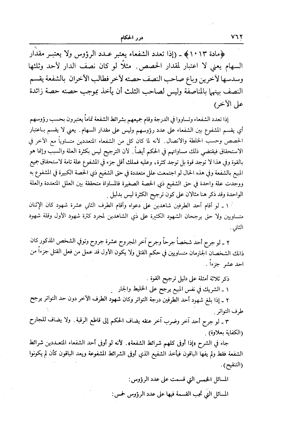 (مَادَّةُ 1013) -، (إذَا تَعَدَّدَ الشُّفَعَاءُ يُعْتَبَرُ عَدَدُ الرُّءُوسِ وَلَا يُعْتَبَرُ مِقْدَارُ السِّهَامِ يَعْنِي لَا اعْتِبَارَ لِمِقْدَارِ الْحِصَصِ. مَثَلًا لَوْ كَانَ نِصْفُ الدَّارِ لِأَحَدٍ وَثُلُثُهَا وَسُدُسُهَا لِآخَرِينَ وَبَاعَ صَاحِبُ النِّصْفِ حِصَّتَهُ لِآخَرَ فَطَالَبَ الْآخَرَانِ بِالشُّفْعَةِ يُقْسَمُ النِّصْفُ بَيْنَهُمَا بِالْمُنَاصَفَةِ وَلَيْسَ لِصَاحِبِ الثُّلُثِ أَنْ يَأْخُذَ بِمُوجِبِ حِصَّتِهِ حِصَّةً زَائِدَةً عَلَى الْآخَرِ) إذَا تَعَدَّدَ الشُّفَعَاءُ وَتَسَاوَوْا فِي الدَّرَجَةِ وَقَامَ جَمِيعُهُمْ بِشَرَائِطِ الشُّفْعَةِ تَمَامًا يُعْتَبَرُونَ بِحَسَبِ رُءُوسِهِمْ أَيْ يُقْسَمُ الْمَشْفُوعُ بَيْنَ الشُّفَعَاءِ عَلَى عَدَدِ رُءُوسِهِمْ وَلَيْسَ عَلَى مِقْدَارِ السِّهَامِ. يَعْنِي لَا يُقْسَمُ بِاعْتِبَارِ الْحِصَصِ وَحَسَبِ الْخُلْطَةِ وَالِاتِّصَالِ؛ لِأَنَّهُ لَمَّا كَانَ كُلٌّ مِنْ الشُّفَعَاءِ الْمُتَعَدِّدِينَ مُتَسَاوِيًا مَعَ الْآخَرِ فِي الِاسْتِحْقَاقِ فَيَقْتَضِي ذَلِكَ مُسَاوَاتَهُمْ فِي الْحُكْمِ أَيْضًا؛ لِأَنَّ التَّرْجِيحَ لَيْسَ بِكَثْرَةِ الْعِلَّةِ وَالسَّبَبِ وَإِنَّمَا هُوَ بِالْقُوَّةِ وَفِي هَذَا لَا تُوجَدُ قُوَّةٌ بَلْ تُوجَدُ كَثْرَةٌ، وَعَلَيْهِ فَمِلْكُ أَقَلِّ جُزْءٍ فِي الْمَشْفُوعِ عِلَّةٌ تَامَّةٌ لِاسْتِحْقَاقِ جَمِيعِ الْمَبِيعِ بِالشُّفْعَةِ وَفِي هَذِهِ الْحَالِ لَوْ اجْتَمَعَتْ عِلَلٌ مُتَعَدِّدَةٌ فِي حَقِّ الشَّفِيعِ ذِي الْحِصَّةِ الْكَبِيرَةِ فِي الْمَشْفُوعِ بِهِ وَوُجِدَتْ عِلَّةٌ وَاحِدَةٌ فِي حَقِّ الشَّفِيعِ ذِي الْحِصَّةِ الصَّغِيرَةِ فَالْمُسَاوَاةُ مُتَحَقِّقَةٌ بَيْنَ الْعِلَلِ الْمُتَعَدِّدَةِ وَالْعِلَّةِ الْوَاحِدَةِ وَقَدْ ذُكِرَ هُنَا مِثَالَانِ عَلَى كَوْنِ تَرْجِيحِ الْكَثْرَةِ لَيْسَ بِدَلِيلٍ:
