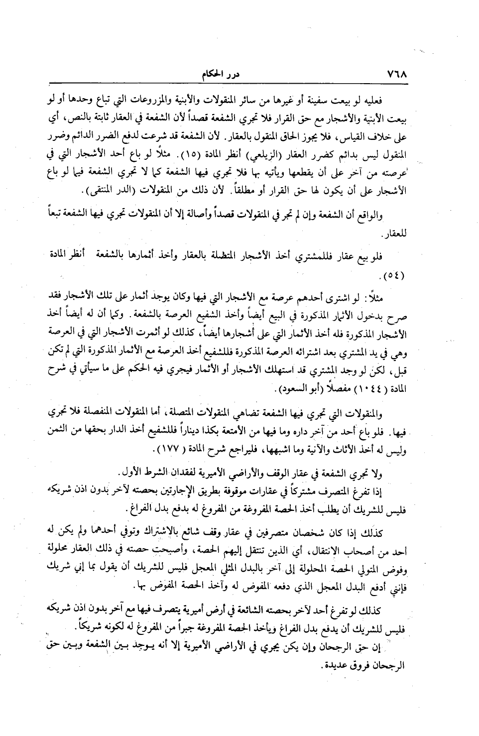 فَعَلَيْهِ لَوْ بِيعَتْ سَفِينَةٌ أَوْ غَيْرُهَا مِنْ سَائِرِ الْمَنْقُولَاتِ وَالْأَبْنِيَةِ وَالْمَزْرُوعَاتِ الَّتِي تُبَاعُ وَحْدَهَا أَوْ لَوْ بِيعَتْ الْأَبْنِيَةُ وَالْأَشْجَارُ مَعَ حَقِّ الْقَرَارِ فَلَا تَجْرِي الشُّفْعَةُ قَصْدًا؛ لِأَنَّ الشُّفْعَةَ فِي الْعَقَارِ ثَابِتَةٌ بِالنَّصِّ، أَيْ عَلَى خِلَافِ الْقِيَاسِ، فَلَا يَجُوزُ إلْحَاقُ الْمَنْقُولِ بِالْعَقَارِ؛ لِأَنَّ الشُّفْعَةَ قَدْ شُرِعَتْ لِدَفْعِ الضَّرَرِ الدَّائِمِ، وَضَرَرُ الْمَنْقُولِ لَيْسَ بِدَائِمٍ كَضَرَرِ الْعَقَارِ، (الزَّيْلَعِيّ) ، اُنْظُرْ الْمَادَّةَ، (5 1) مَثَلًا لَوْ بَاعَ أَحَدٌ الْأَشْجَارَ الَّتِي فِي عَرْصَتِهِ مِنْ آخَرَ عَلَى أَنْ يَقْطَعَهَا وَيَأْتِيَهُ بِهَا فَلَا تَجْرِي فِيهَا الشُّفْعَةُ كَمَا لَا تَجْرِي الشُّفْعَةُ فِيمَا لَوْ بَاعَ الْأَشْجَارَ عَلَى أَنْ يَكُونَ لَهَا حَقُّ الْقَرَارِ أَوْ مُطْلَقًا؛ لِأَنَّ ذَلِكَ مِنْ الْمَنْقُولَاتِ، (الدُّرُّ الْمُنْتَقَى) وَالْوَاقِعُ أَنَّ الشُّفْعَةَ وَإِنْ لَمْ تَجْرِ فِي الْمَنْقُولَاتِ قَصْدًا وَأَصَالَةً إلَّا أَنَّ الْمَنْقُولَاتِ تَجْرِي فِيهَا الشُّفْعَةُ تَبَعًا لِلْعَقَارِ. فَلَوْ بِيعَ عَقَارٌ فَلِلْمُشْتَرِي أَخْذُ الْأَشْجَارِ الْمُتَّصِلَةِ بِالْعَقَارِ وَأَخْذُ أَثِمَارهَا بِالشُّفْعَةِ، اُنْظُرْ الْمَادَّةَ، (4 5) . مَثَلًا: لَوْ اشْتَرَى أَحَدُهُمْ عَرْصَةً مَعَ الْأَشْجَارِ الَّتِي فِيهَا وَكَانَ يُوجَدُ أَثِمَارٌ عَلَى تِلْكَ الْأَشْجَارِ فَقَدْ صَرَّحَ بِدُخُولِ الْأَثْمَارِ الْمَذْكُورَةِ فِي الْبَيْعِ أَيْضًا وَأَخَذَ الشَّفِيعُ الْعَرْصَةَ بِالشُّفْعَةِ. وَكَمَا أَنَّ لَهُ أَيْضًا أَخْذُ الْأَشْجَارِ الْمَذْكُورَةِ فَلَهُ أَخْذُ الْأَثْمَارِ الَّتِي عَلَى أَشْجَارِهَا أَيْضًا، كَذَلِكَ لَوْ أَثْمَرَتْ الْأَشْجَارُ الَّتِي فِي الْعَرْصَةِ وَهِيَ فِي يَدِ الْمُشْتَرِي بَعْدَ اشْتِرَائِهِ الْعَرْصَةَ الْمَذْكُورَةَ فَلِلشَّفِيعِ أَخْذُ الْعَرْصَةِ مَعَ الْأَثْمَارِ الْمَذْكُورَةِ الَّتِي لَمْ تَكُنْ قَبْلُ، لَكِنْ لَوْ وَجَدَ الْمُشْتَرِي قَدْ اسْتَهْلَكَ الْأَشْجَارَ أَوْ الْأَثْمَارَ فَيَجْرِي فِيهِ الْحُكْمُ عَلَى مَا سَيَأْتِي فِي شَرْحِ الْمَادَّةِ، (1044) مُفَصَّلًا، (أَبُو السُّعُودِ) .