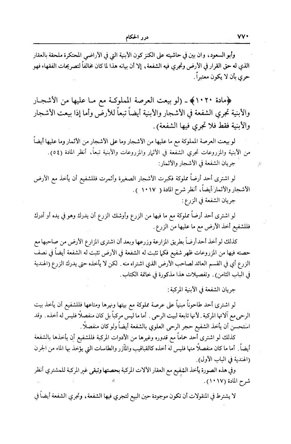 (مَادَّةُ 1020) -، (لَوْ بِيعَتْ الْعَرْصَةُ الْمَمْلُوكَةُ مَعَ مَا عَلَيْهَا مِنْ الْأَشْجَارِ وَالْأَبْنِيَةِ تَجْرِي الشُّفْعَةُ فِي الْأَشْجَارِ وَالْأَبْنِيَةِ أَيْضًا تَبَعًا لِلْأَرْضِ، وَأَمَّا إذَا بِيعَتْ الْأَشْجَارُ وَالْأَبْنِيَةُ فَقَطْ فَلَا تَجْرِي فِيهَا الشُّفْعَةُ) . لَوْ بِيعَتْ الْعَرْصَةُ الْمَمْلُوكَةُ مَعَ مَا عَلَيْهَا مِنْ الْأَشْجَارِ وَمَا عَلَى الْأَشْجَارِ مِنْ الْأَثْمَارِ وَمَا عَلَيْهَا أَيْضًا مِنْ الْأَبْنِيَةِ وَالْمَزْرُوعَاتِ تَجْرِي الشُّفْعَةُ فِي الْأَثْمَارِ وَالْمَزْرُوعَاتِ وَالْأَبْنِيَةِ تَبَعًا، اُنْظُرْ الْمَادَّةَ، (4 5) جَرَيَانُ الشُّفْعَةِ فِي الْأَشْجَارِ وَالْأَثْمَارِ: لَوْ اشْتَرَى أَحَدٌ أَرْضًا مَمْلُوكَةً فَكَبِرَتْ الْأَشْجَارُ الصَّغِيرَةُ وَأَثْمَرَتْ فَلِلشَّفِيعِ أَنْ يَأْخُذَ مَعَ الْأَرْضِ الْأَشْجَارِ وَالْأَثْمَارِ أَيْضًا، اُنْظُرْ شَرْحَ الْمَادَّةِ، (17.1) . جَرَيَانُ الشُّفْعَةِ فِي الزَّرْعِ: لَوْ اشْتَرَى أَحَدٌ أَرْضًا مَمْلُوكَةً مَعَ مَا فِيهَا مِنْ الزَّرْعِ وَأَوْشَكَ الزَّرْعُ أَنْ يُدْرِكَ وَهُوَ فِي يَدِهِ أَوْ أَدْرَكَ فَلِلشَّفِيعِ أَخْذُ الْأَرْضِ مَعَ مَا عَلَيْهَا مِنْ الزَّرْعِ. كَذَلِكَ لَوْ أَخَذَ أَحَدٌ أَرْضًا بِطَرِيقِ الْمُزَارَعَةِ وَزَرَعَهَا وَبَعْدَ أَنْ اشْتَرَى الْمَزَارِعُ الْأَرْضَ مِنْ صَاحِبِهَا مَعَ حِصَّتِهِ فِيهَا مِنْ الْمَزْرُوعَاتِ ظَهَرَ شَفِيعٌ فَكَمَا تَثْبُتُ لَهُ الشُّفْعَةُ فِي الْأَرْضِ تَثْبُتُ لَهُ الشُّفْعَةُ أَيْضًا فِي نِصْفِ الزَّرْعِ أَيْ فِي الْقَسْمِ الْعَائِدِ لِصَاحِبِ الْأَرْضِ الَّذِي اشْتَرَاهُ مِنْهُ. لَكِنْ لَا يَأْخُذُهُ حَتَّى يُدْرِكَ الزَّرْعُ، (الْهِنْدِيَّةُ فِي الْبَابِ الثَّامِنِ) .