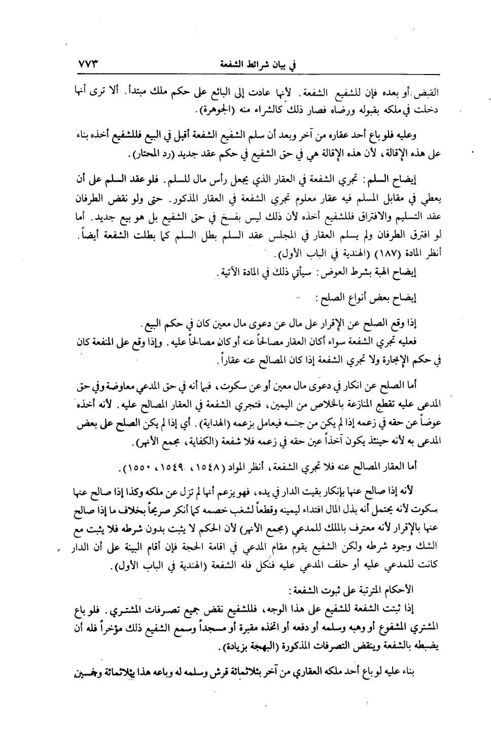 إيضَاحُ السَّلَمِ: تَجْرِي الشُّفْعَةُ فِي الْعَقَارِ الَّذِي يُجْعَلُ رَأْسَ مَالِ لِلسَّلَمِ فَلَوْ عَقَدَ السَّلَمَ عَلَى أَنْ يُعْطِيَ فِي مُقَابِلِ الْمُسَلَّمِ فِيهِ عَقَارًا مَعْلُومًا تَجْرِي الشُّفْعَةُ فِي الْعَقَارِ الْمَذْكُورِ. حَتَّى وَلَوْ نَقَضَ الطَّرَفَانِ عَقْدَ التَّسْلِيمِ وَالِافْتِرَاقِ فَلِلشَّفِيعِ أَخْذُهُ؛ لِأَنَّ ذَلِكَ لَيْسَ بِفَسْخٍ فِي حَقِّ الشَّفِيعِ بَلْ هُوَ بَيْعٌ جَدِيدٌ. أَمَّا لَوْ افْتَرَقَ الطَّرَفَانِ وَلَمْ يُسَلَّمْ الْعَقَارَ فِي الْمَجْلِسِ، عَقْدُ السَّلَمِ، بَطَلَ السَّلَمُ كَمَا بَطَلَتْ الشُّفْعَةُ أَيْضًا. اُنْظُرْ الْمَادَّةَ، (187) ، (الْهِنْدِيَّةُ فِي الْبَابِ الْأَوَّلِ) .