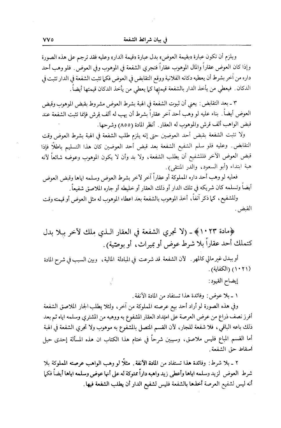 وَيَلْزَمُ أَنْ تَكُونَ عِبَارَةُ " بِقِيمَةِ الْعِوَضِ، بَدَلَ عِبَارَةِ " قِيمَةُ الدَّارِ " وَعَلَيْهِ فَقَدْ تُرْجِمَ عَلَى هَذِهِ الصُّورَةِ، وَإِذَا كَانَ الْعِوَضُ عَقَارًا وَالْمَالُ الْمَوْهُوبُ عَقَارًا فَتَجْرِي الشُّفْعَةُ فِي الْمَوْهُوبِ وَفِي الْعِوَضِ فَلَوْ وَهَبَ أَحَدٌ دَارِهِ مِنْ آخَرَ بِشَرْطِ أَنْ يُعْطِيَهُ دُكَّانَهُ الْفُلَانِيَّةَ وَوَقَعَ التَّقَابُضُ فِي الْعِوَضِ فَكَمَا تَثْبُتُ الشُّفْعَةُ فِي الدَّارِ تَثْبُتُ فِي الدُّكَّانِ. فَيُعْطِي مَنْ يَأْخُذُ الدَّارَ بِالشُّفْعَةِ قِيمَتَهَا كَمَا يُعْطِي مَنْ يَأْخُذُ الدُّكَّانَ قِيمَتَهَا أَيْضًا.