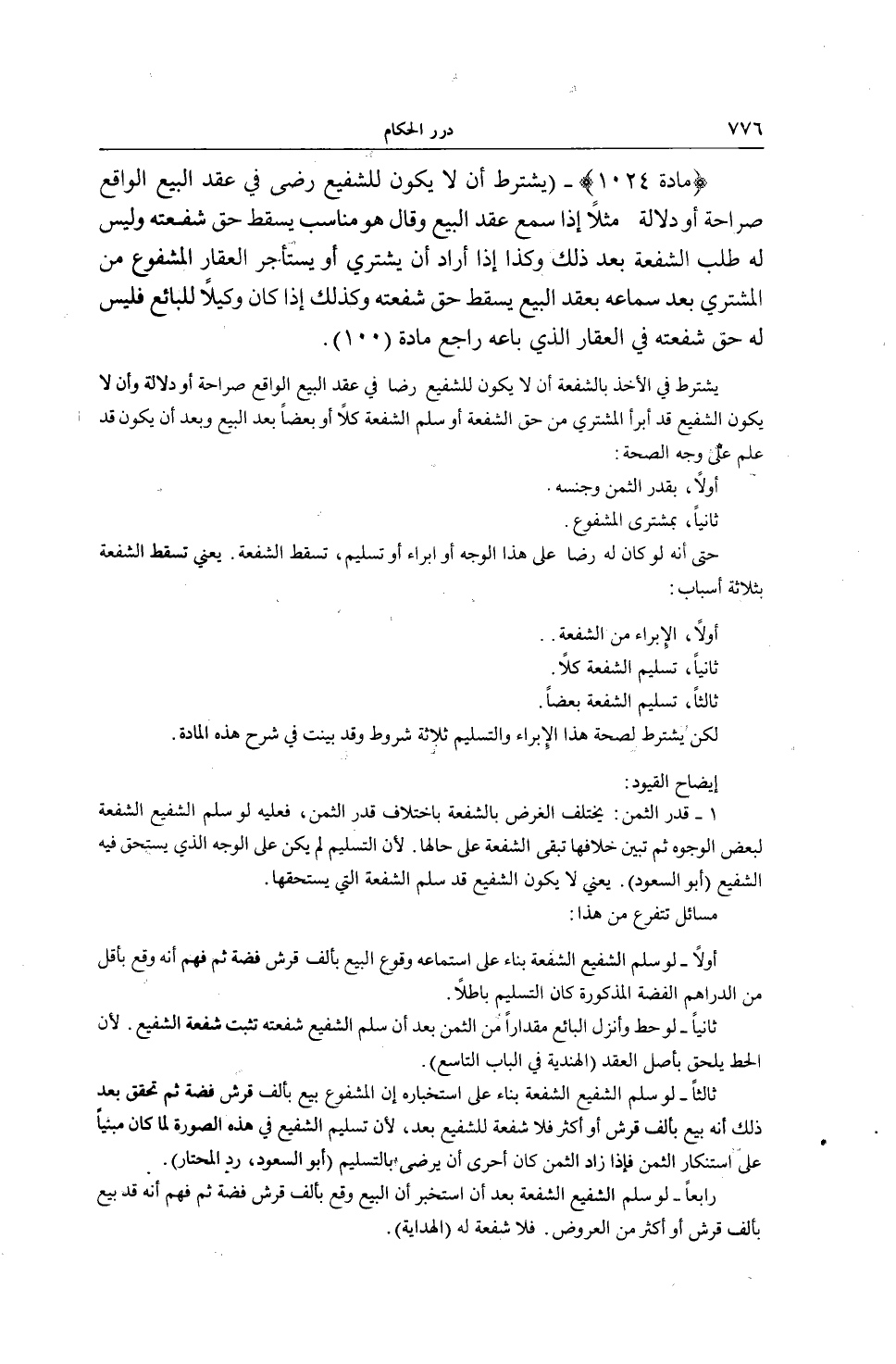 (مَادَّةُ 1024) -، (يُشْتَرَطُ أَنْ لَا يَكُونَ لِلشَّفِيعِ رِضًى فِي عَقْدِ الْبَيْعِ الْوَاقِعِ صَرَاحَةً أَوْ دَلَالَةً مَثَلًا إذَا سَمِعَ عَقْدَ الْبَيْعِ وَقَالَ هُوَ مُنَاسِبٌ يَسْقُطُ حَقُّ شُفْعَتِهِ وَلَيْسَ لَهُ طَلَبُ الشُّفْعَةِ بَعْدَ ذَلِكَ وَكَذَا إذَا أَرَادَ أَنْ يَشْتَرِيَ أَوْ يَسْتَأْجِرَ الْعَقَارَ الْمَشْفُوعَ مِنْ الْمُشْتَرِي بَعْدَ سَمَاعِهِ بِعَقْدِ الْبَيْعِ يَسْقُطُ حَقُّ شُفْعَتِهِ وَكَذَلِكَ إذَا كَانَ وَكِيلًا لِلْبَائِعِ فَلَيْسَ لَهُ حَقُّ شُفْعَتِهِ فِي الْعَقَارِ الَّذِي بَاعَهُ رَاجِعْ مَادَّةَ، 100) . يُشْتَرَطُ فِي الْأَخْذِ بِالشُّفْعَةِ أَنْ لَا يَكُونَ لِلشَّفِيعِ رِضًا فِي عَقْدِ الْبَيْعِ الْوَاقِعِ صَرَاحَةً أَوْ دَلَالَةً وَأَنْ لَا يَكُونَ الشَّفِيعُ قَدْ أَبْرَأَ الْمُشْتَرِيَ مِنْ حَقِّ الشُّفْعَةِ أَوْ سَلَّمَ الشُّفْعَةَ كُلًّا أَوْ بَعْضًا بَعْدَ الْبَيْعِ وَبَعْدَ أَنْ يَكُونَ قَدْ عَلِمَ عَلَى وَجْهِ الصِّحَّةِ: