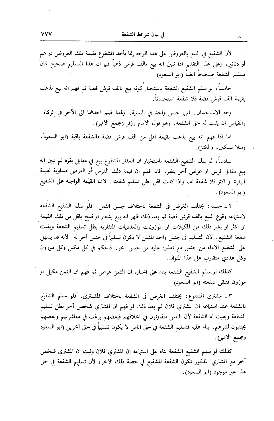 2 - جِنْسُهُ: يَخْتَلِفُ الْغَرَضُ فِي الشُّفْعَةِ بِاخْتِلَافِ جِنْسِ الثَّمَنِ. فَلَوْ سَلَّمَ الشَّفِيعُ الشُّفْعَةَ لِاسْتِمَاعِهِ وُقُوعَ الْبَيْعِ بِأَلْفِ قِرْشٍ فِضَّةً ثُمَّ بَعْدَ ذَلِكَ ظَهَرَ أَنَّهُ بِيعَ بِشَعِيرٍ أَوْ قَمْحٍ بِأَقَلَّ مِنْ تِلْكَ الْقِيمَةِ أَوْ أَكْثَرَ أَوْ بِغَيْرِ ذَلِكَ مِنْ الْمَكِيلَاتِ أَوْ الْمَوْزُونَاتِ وَالْعَدَدِيَّاتِ الْمُتَقَارِبَةِ بَطَلَ تَسْلِيمُ الشُّفْعَةِ وَبَقِيَتْ شُفْعَةُ الشَّفِيعِ؛ لِأَنَّ التَّسْلِيمَ فِي جِنْسٍ وَاحِدٍ لِلثَّمَنِ لَا يَكُونُ تَسْلِيمًا فِي جِنْسٍ آخَرَ لَهُ؛ لِأَنَّهُ قَدْ يَسْهُلُ عَلَى الشَّفِيعِ الْأَدَاءُ مِنْ جِنْسٍ مَعَ تَعَذُّرِهِ عَلَيْهِ مِنْ جِنْسٍ آخَرَ، فَالْحُكْمُ فِي كُلِّ مَكِيلٍ وَكُلِّ مَوْزُونٍ وَكُلِّ عَدَدِيٍّ مُتَقَارِبٌ عَلَى هَذَا الْمِنْوَالِ. كَذَلِكَ لَوْ سَلَّمَ الشَّفِيعُ الشُّفْعَةَ بِنَاءً عَلَى إخْبَارِهِ أَنَّ الثَّمَنَ عَرَضٌ ثُمَّ فَهِمَ أَنَّ الثَّمَنَ مَكِيلٌ أَوْ مَوْزُونٌ فَتَبْقَى شُفْعَتُهُ، (أَبُو السُّعُودِ) .