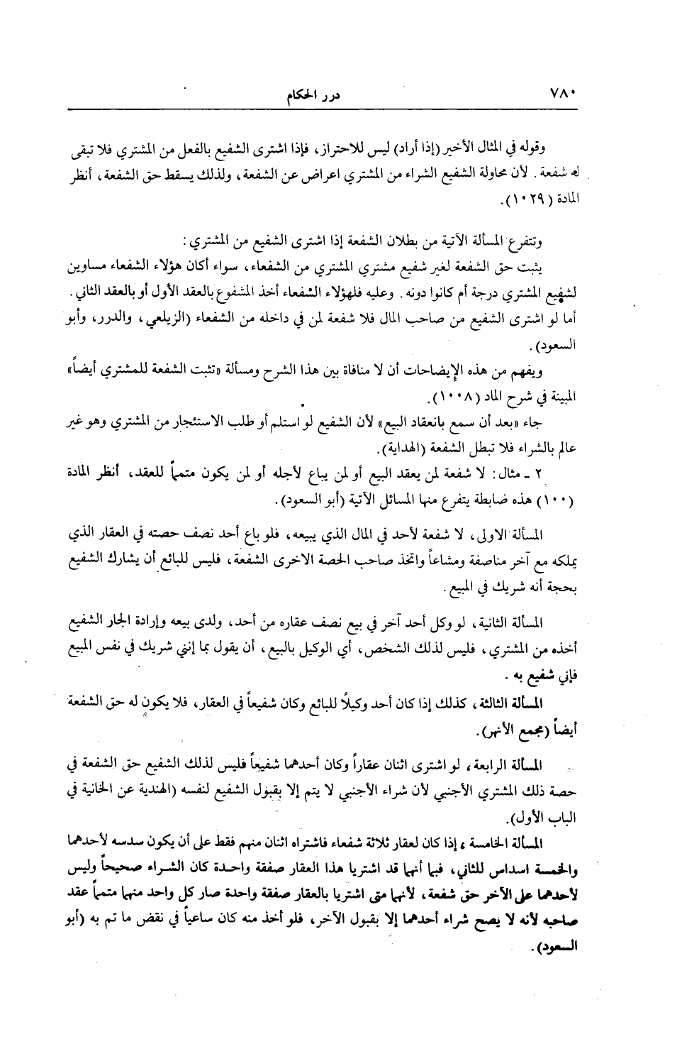 2 - مِثَالُ: لَا شُفْعَةَ لِمَنْ يَعْقِدُ الْبَيْعَ أَوْ لِمَنْ يُبَاعُ لِأَجْلِهِ أَوْ لِمَنْ يَكُونُ مُتِمًّا لِلْعَقْدِ، اُنْظُرْ الْمَادَّةَ، (100) هَذِهِ ضَابِطَةٌ يَتَفَرَّعُ مِنْهَا الْمَسَائِلُ الْآتِيَةِ، (أَبُو السُّعُودِ) .