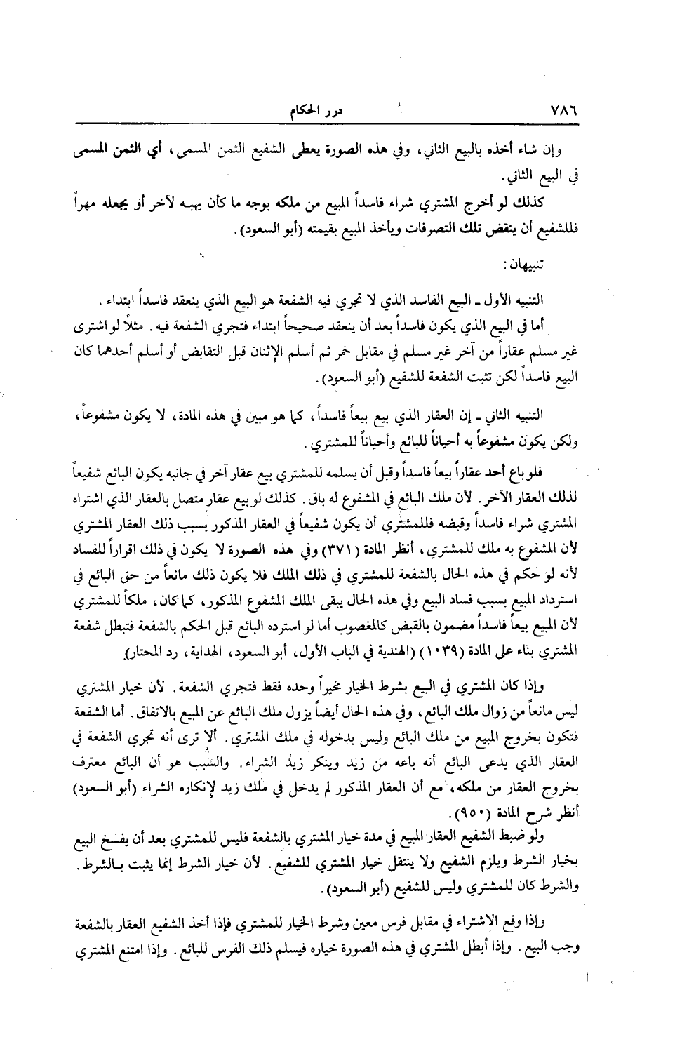 التَّنْبِيهُ الْأَوَّلُ - الْبَيْعُ الْفَاسِدُ الَّذِي لَا تَجْرِي فِيهِ الشُّفْعَةُ هُوَ الْبَيْعُ الَّذِي يَنْعَقِدُ فَاسِدًا ابْتِدَاءً. أَمَّا فِي الْبَيْعِ الَّذِي يَكُونُ فَاسِدًا بَعْدَ أَنْ يَنْعَقِدَ صَحِيحًا ابْتِدَاءً فَتَجْرِي الشُّفْعَةُ فِيهِ مَثَلًا لَوْ اشْتَرَى غَيْرُ مُسْلِمٍ عَقَارًا مِنْ آخَرَ غَيْرِ مُسْلِمٍ فِي مُقَابِلِ خَمْرٍ ثُمَّ أَسْلَمَ الِاثْنَانِ قَبْلَ التَّقَابُضِ، أَوْ أَسْلَمَ أَحَدُهُمَا كَانَ الْبَيْعُ فَاسِدًا لَكِنْ تَثْبُتُ الشُّفْعَةُ لِلشَّفِيعِ، (أَبُو السُّعُودِ) .