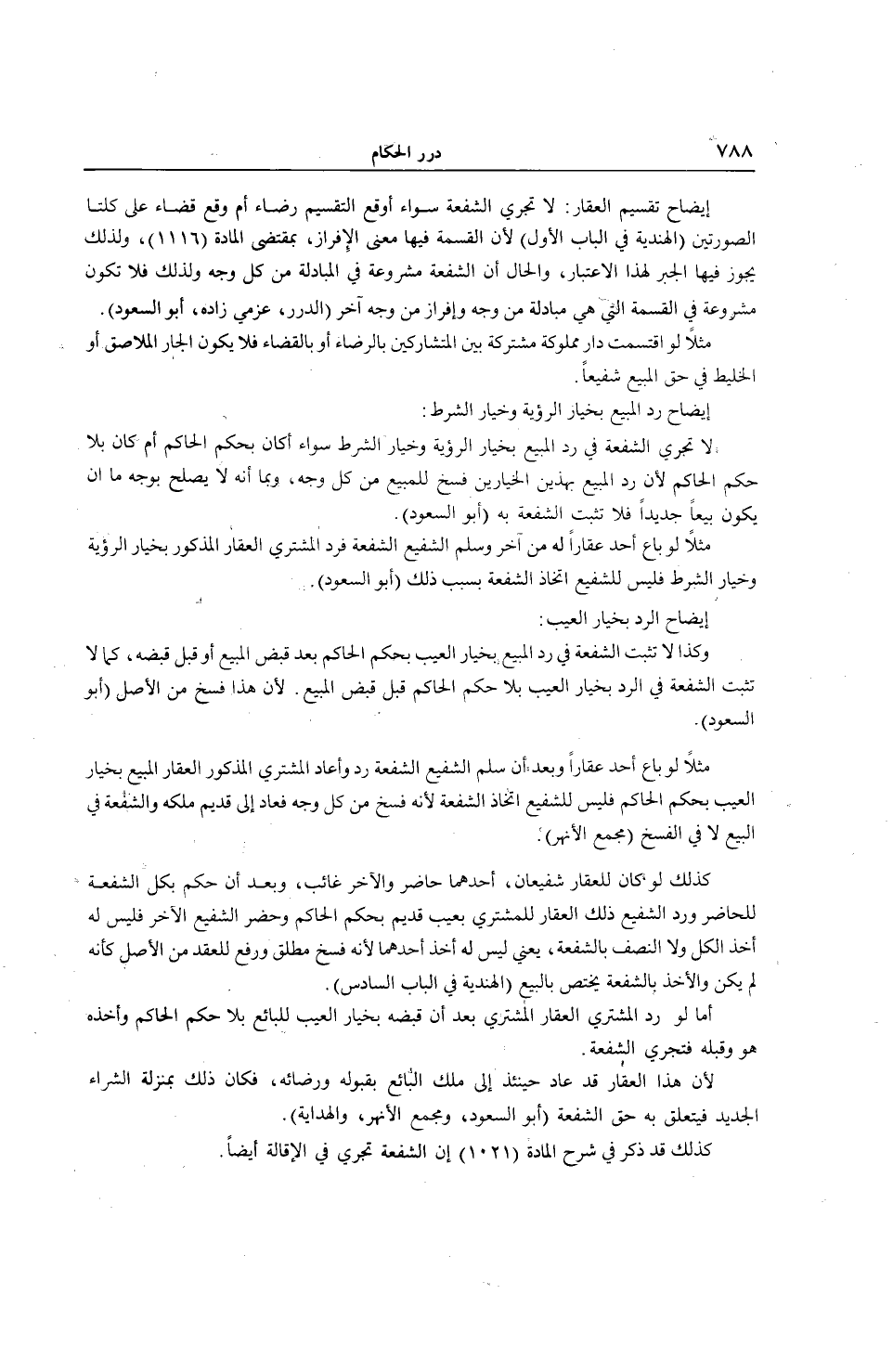 مَثَلًا لَوْ بَاعَ أَحَدٌ عَقَارًا لَهُ مِنْ آخَرَ وَسَلَّمَ الشَّفِيعُ الشُّفْعَةَ فَرَدَّ الْمُشْتَرِي الْعَقَارَ الْمَذْكُورَ بِخِيَارِ الرُّؤْيَةِ وَخِيَارِ الشَّرْطِ فَلَيْسَ لِلشَّفِيعِ اتِّخَاذُ الشُّفْعَةِ بِسَبَبِ ذَلِكَ، (أَبُو السُّعُودِ) .