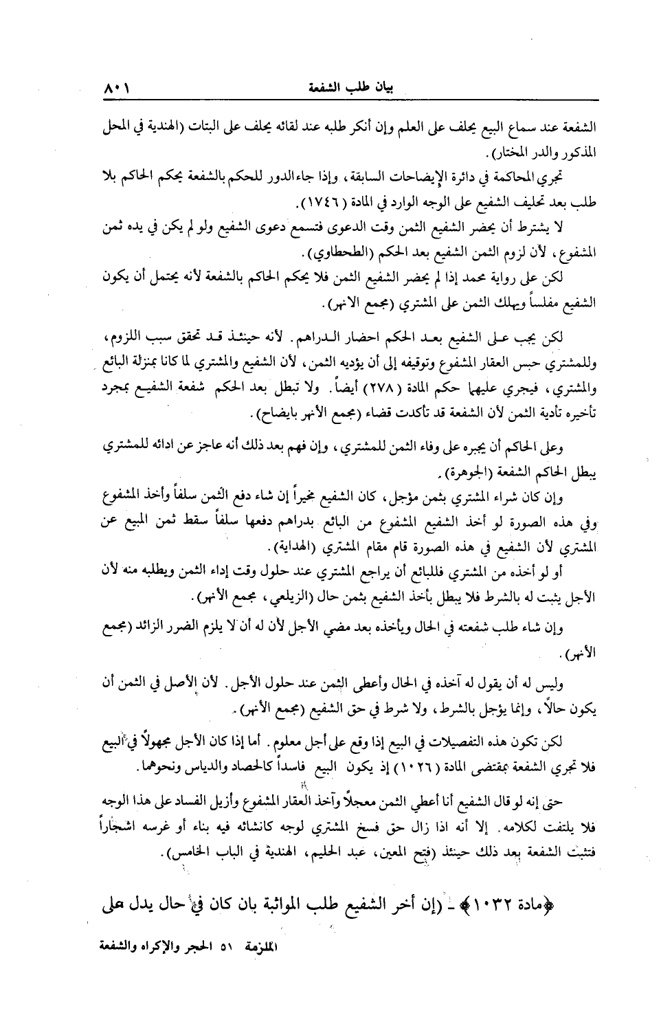 لَكِنْ تَكُونُ هَذِهِ التَّفْصِيلَاتُ فِي الْبَيْعِ إذَا وَقَعَ عَلَى أَجَلٍ مَعْلُومٍ. أَمَّا إذَا كَانَ الْأَجَلُ مَجْهُولًا فِي الْبَيْعِ فَلَا تَجْرِي الشُّفْعَةُ بِمُقْتَضَى الْمَادَّةِ، (1026) إذْ يَكُونُ الْبَيْعُ فَاسِدًا كَالْحَصَادِ وَالدِّيَاسِ وَنَحْوِهِمَا. حَتَّى إنَّهُ لَوْ قَالَ الشَّفِيعُ أَنَا أُعْطِي الثَّمَنَ مُعَجَّلًا وَآخُذُ الْعَقَارَ الْمَشْفُوعَ وَأُزِيلُ الْفَسَادَ عَلَى هَذَا الْوَجْهِ فَلَا يُلْتَفَتُ لِكَلَامِهِ. إلَّا أَنَّهُ إذَا زَالَ حَقُّ فَسْخِ الْمُشْتَرِي لِوَجْهٍ كَإِنْشَائِهِ فِيهِ بِنَاءً أَوْ غَرْسِهِ أَشْجَارًا فَتَثْبُتُ الشُّفْعَةُ بَعْدَ ذَلِكَ حِينَئِذٍ، (فَتْحُ الْمُعِينِ، عَبْدُ الْحَلِيمِ، الْهِنْدِيَّةُ فِي الْبَابِ الْخَامِسِ) .