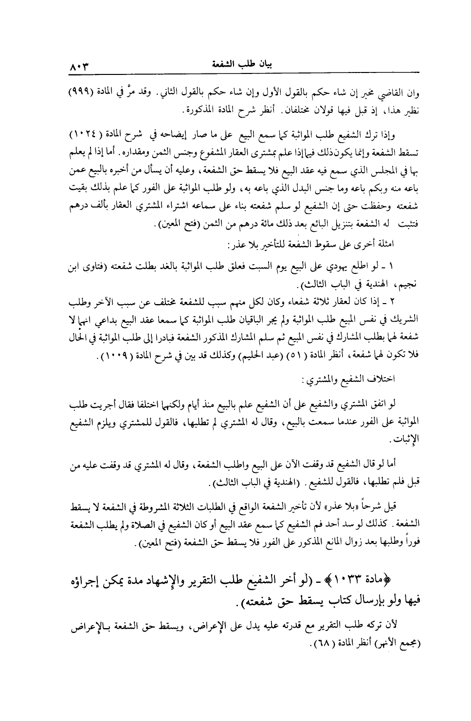 (مَادَّةُ 1033) -، (لَوْ أَخَّرَ الشَّفِيعُ طَلَبَ التَّقْرِيرِ وَالْإِشْهَادِ مُدَّةً يُمْكِنُ إجْرَاؤُهُ فِيهَا وَلَوْ بِإِرْسَالِ كِتَابٍ يَسْقُطُ حَقُّ شُفْعَتِهِ) ؛ لِأَنَّ تَرْكَهُ طَلَبَ التَّقْرِيرِ مَعَ قُدْرَتِهِ عَلَيْهِ يَدُلُّ عَلَى الْإِعْرَاضِ، وَيَسْقُطُ حَقُّ الشُّفْعَةِ بِالْإِعْرَاضِ، (مَجْمَعُ الْأَنْهُرِ) اُنْظُرْ الْمَادَّةَ، (68) .