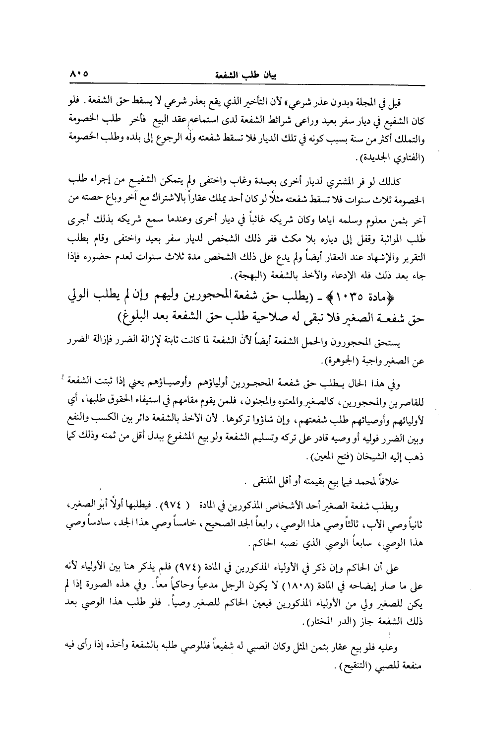(مَادَّةُ 1035) -، (يَطْلُبُ حَقَّ شُفْعَةِ الْمَحْجُورِينَ وَلِيُّهُمْ وَإِنْ لَمْ يَطْلُبْ الْوَلِيُّ حَقَّ شُفْعَةِ الصَّغِيرِ فَلَا تَبْقَى لَهُ صَلَاحِيَّةُ طَلَبِ حَقِّ الشُّفْعَةِ بَعْدَ الْبُلُوغِ) يَسْتَحِقُّ الْمَحْجُورُونَ وَالْحَمْلُ الشُّفْعَةَ أَيْضًا؛ لِأَنَّ الشُّفْعَةَ لَمَّا كَانَتْ ثَابِتَةً لِإِزَالَةِ الضَّرَرِ فَإِزَالَةُ الضَّرَرِ عَنْ الصَّغِيرِ وَاجِبَةٌ، (الْجَوْهَرَةُ) .